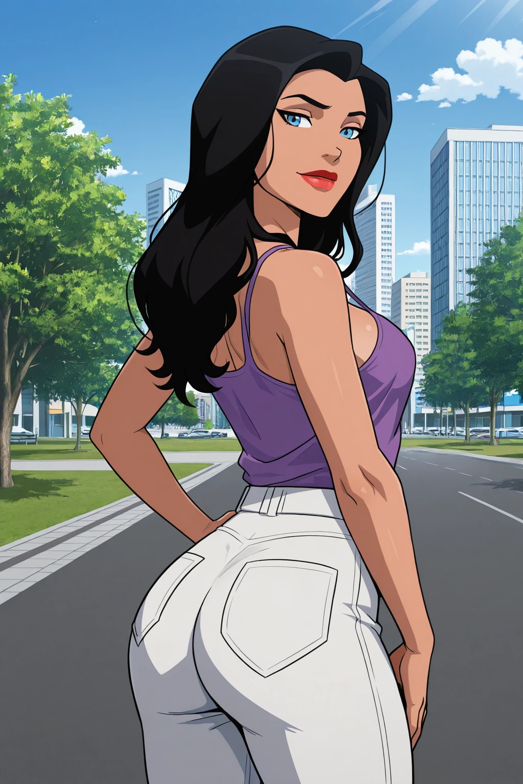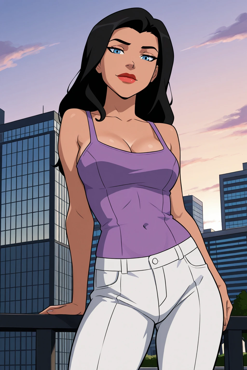 Casual Outfit S1: cleavage, tank top, purple tank top, white pants, heels