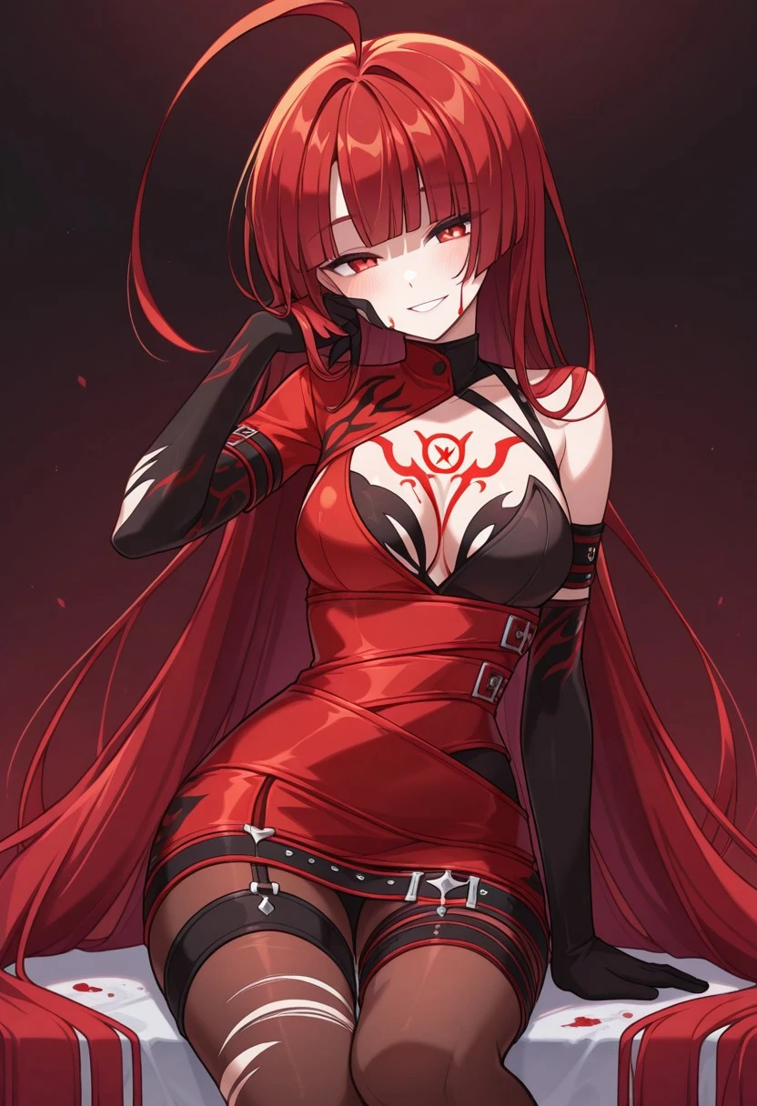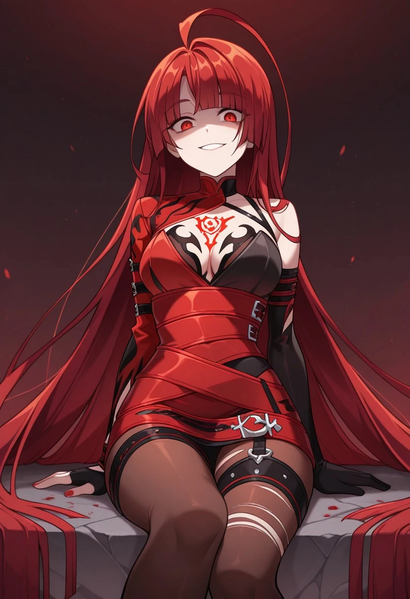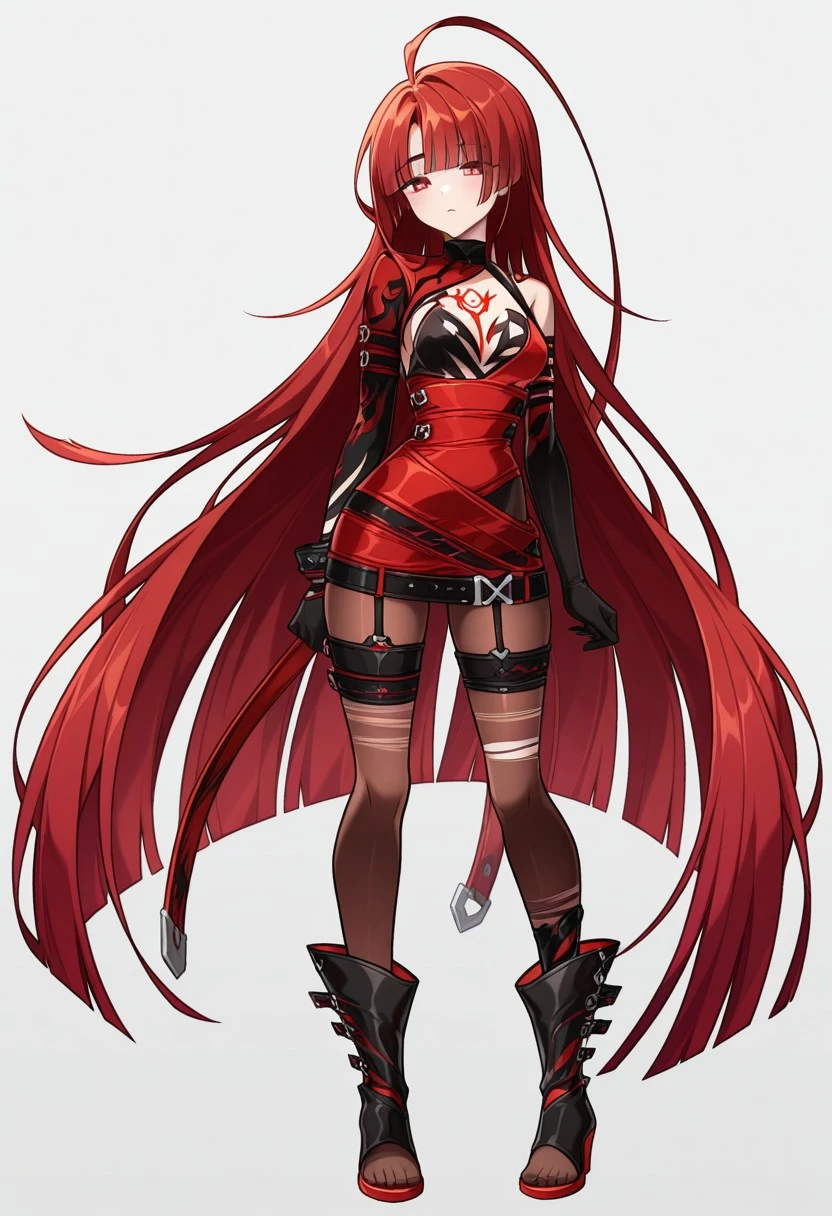 1 girl, elesisBQ, red hair, ahoge, absurdly long hair, blunt bangs, blunt ends, chest tattoo, cleavage, asymmetrical clothes, dress, red dress, short dress, belt, red belt, open belt, black gloves, elbow gloves, elesisBQ gloves, torn pantyhose, asymmetrical pantyhose, brown pantyhose, elesisBQ boots, black boots, open-toe boots, skin tightWeapons