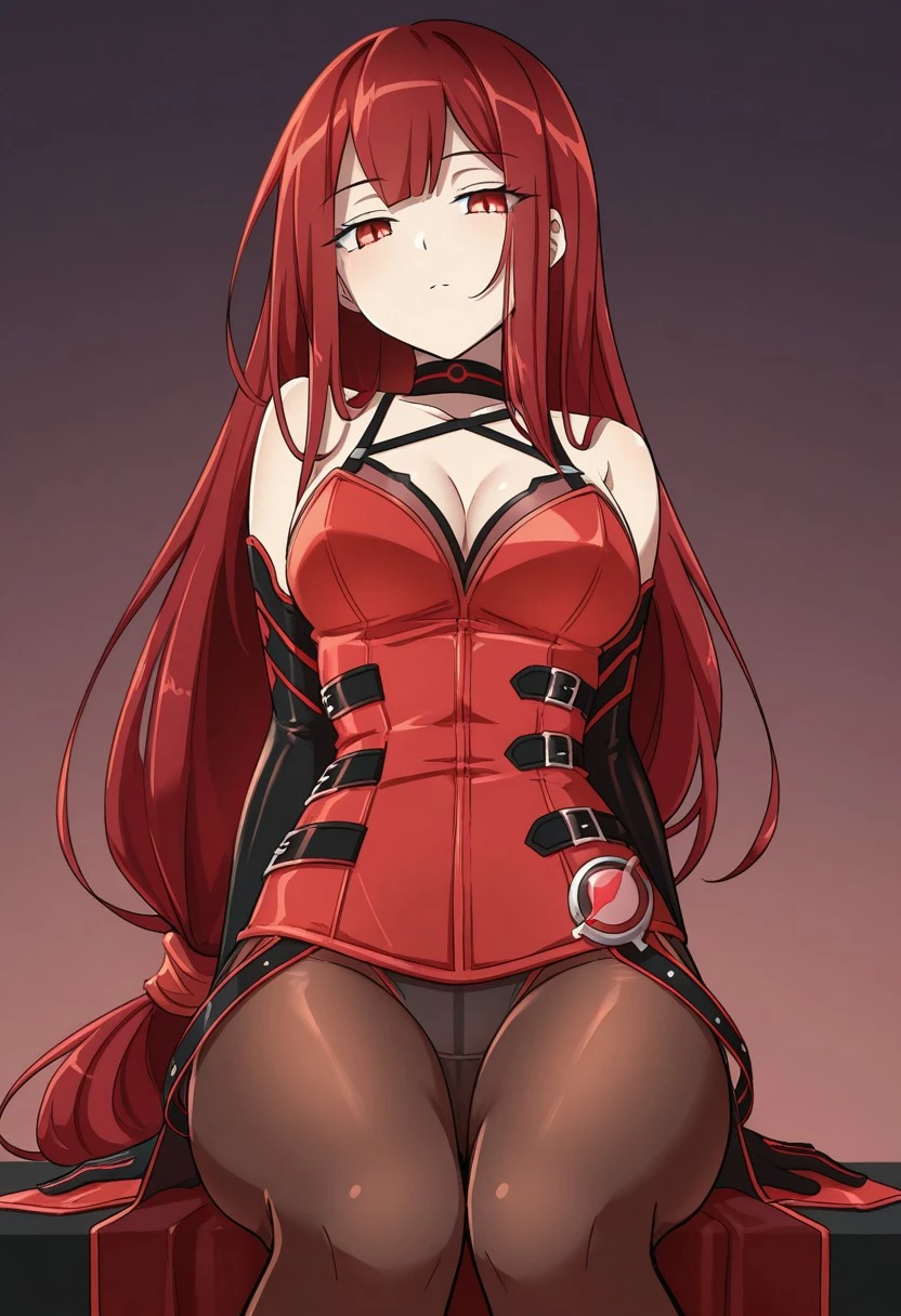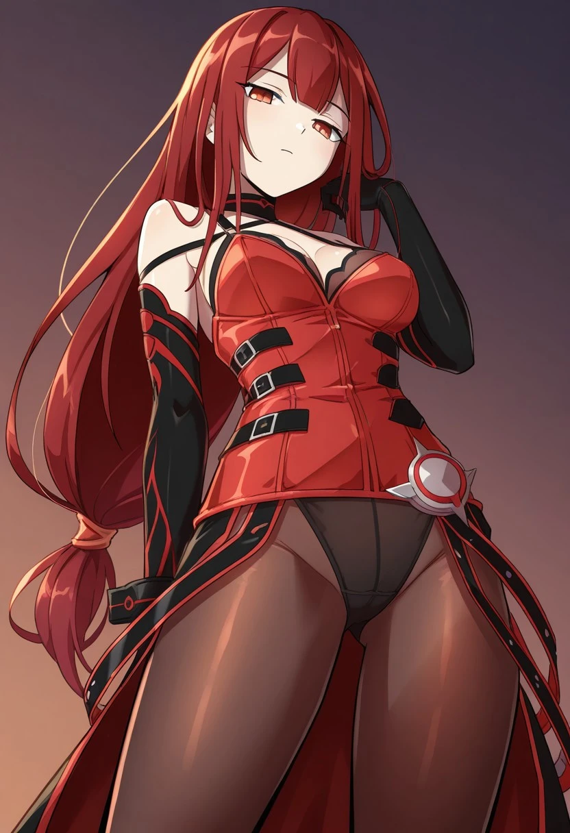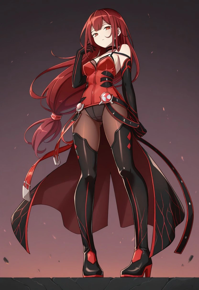 1 girl, elesisCA, red hair, very long hair, low-tied long hair, parted bangs, red eyes, choker, cleavage, camisole, red camisole, elbow gloves, elesisCA gloves, panties, black panties, panties over pantyhose, belt, showgirl skirt, brown pantyhose, thighhighs, black boots, thigh boots, elesisCA thigh boots, high heels bootsElesis - Bloody queen