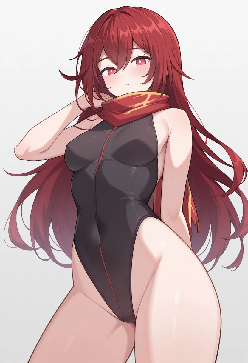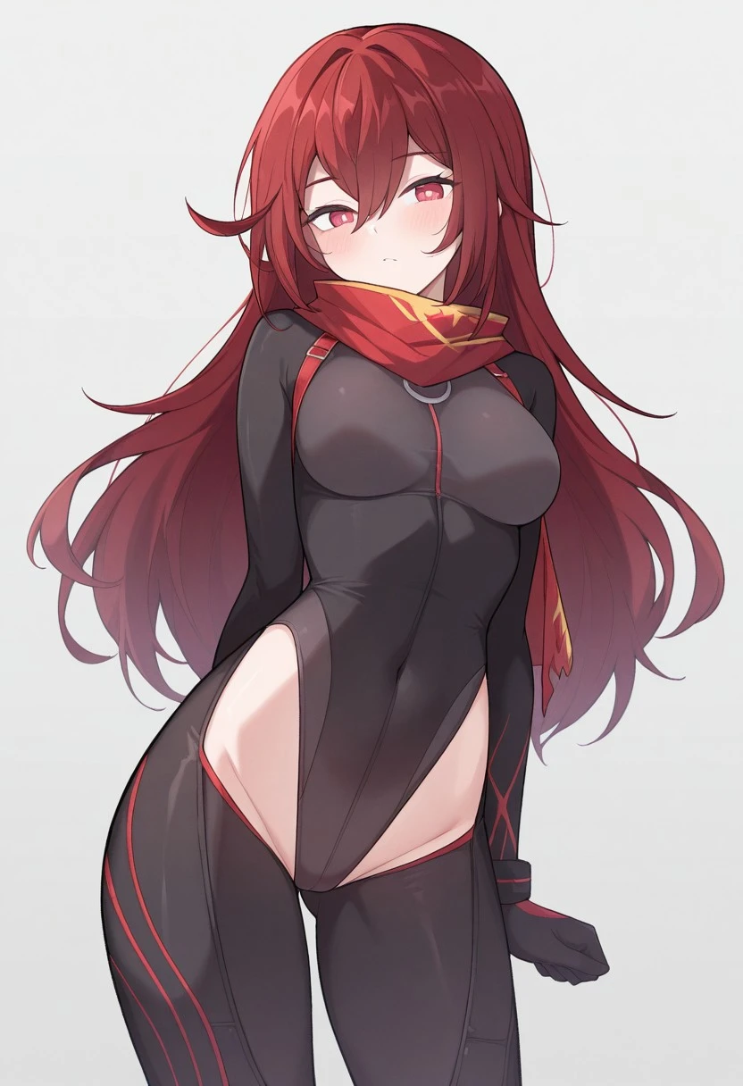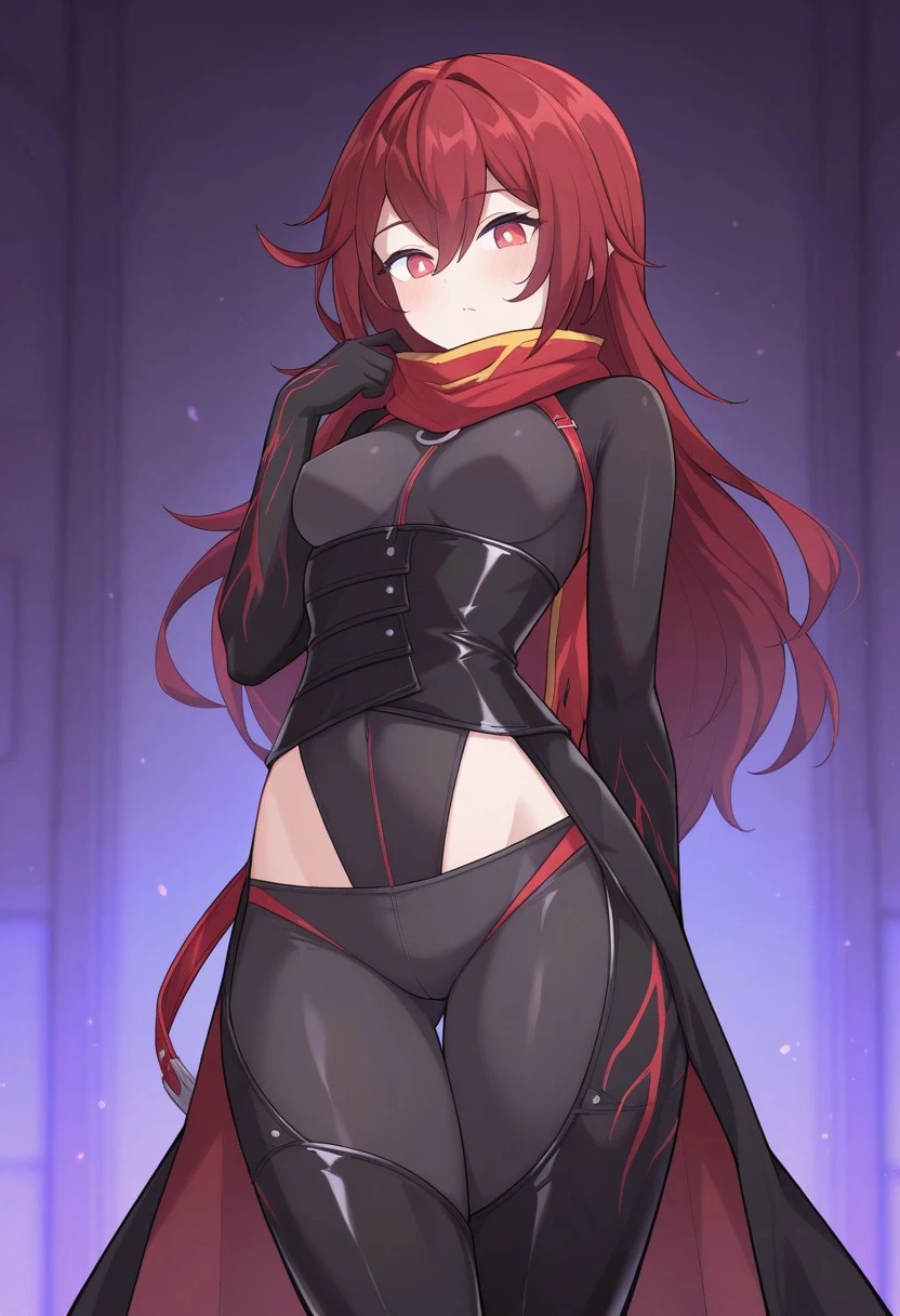1 girl, elesisDK, red hair, long hair, red eyes, scarf, red scarf, tight clothes, bodysuit, highleg leotard, elesisdk leotard, black leotard, corset, latex pants, showgirl skirt, black thighhighs, black boots, thigh boots, elesisdk thigh bootsElesis - Crimson avenger