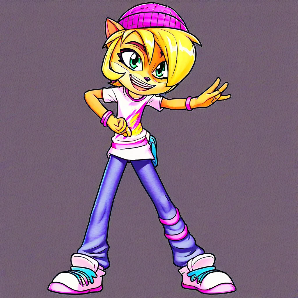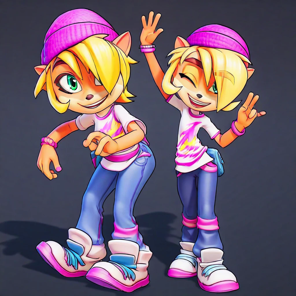 Coco Bandicoot, beanie, bracelet, short_hair, white_footwear, blonde_hair, pink_headwear, blue_pants, jewelry, shoes, pants, shirt, hat, white_shirt