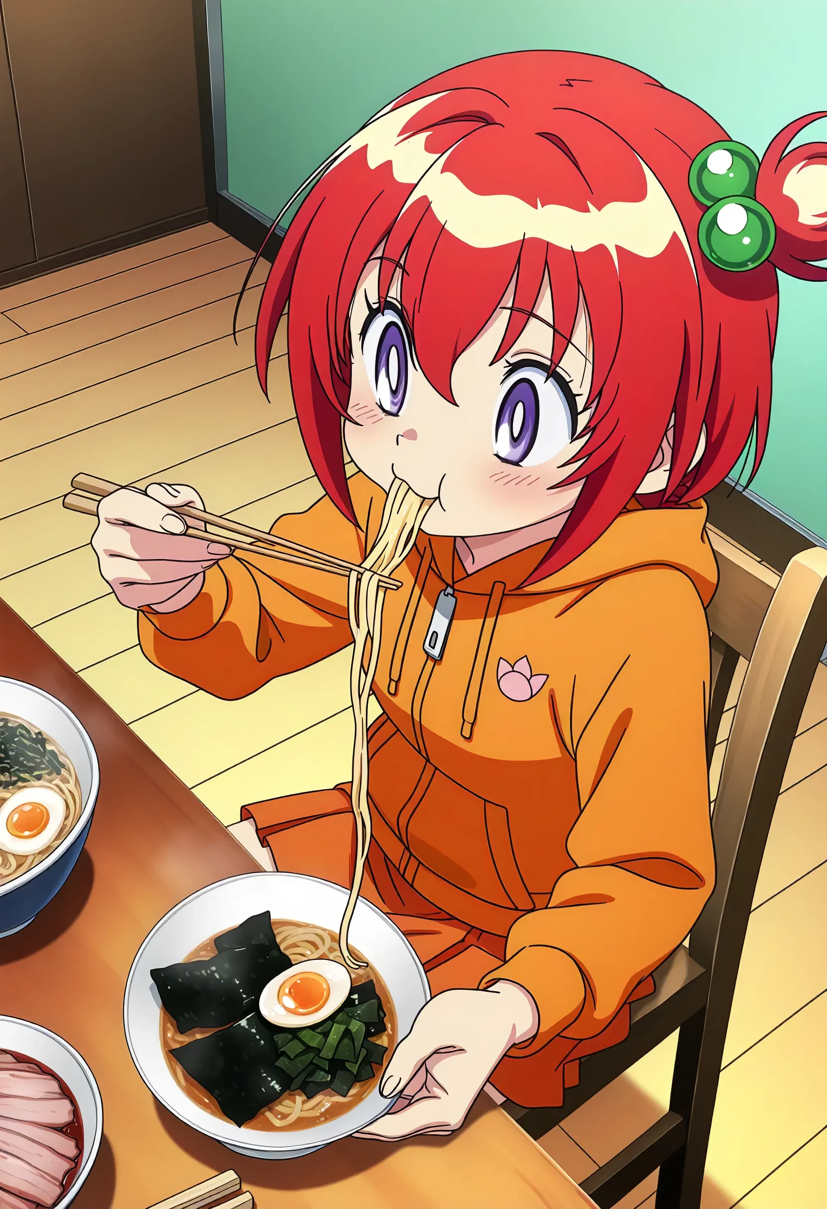 ichigeki danko, red hair, one side up, purple eyes, hair bobbles, white t-shirt, clothes writing, midriff, black fingerless gloves, elbow gloves, black bike shorts, orange shoes,