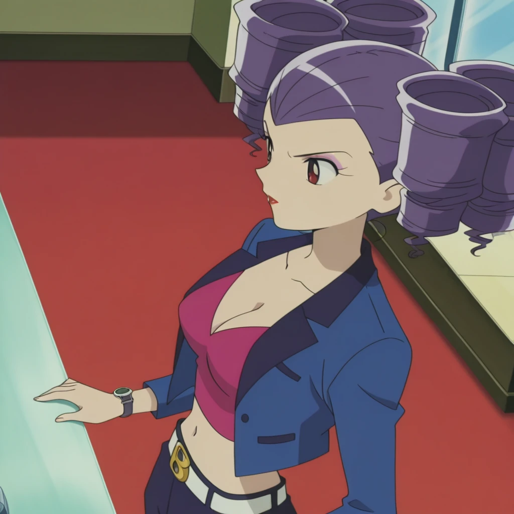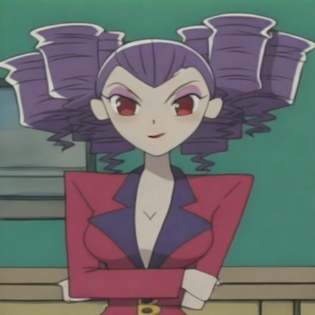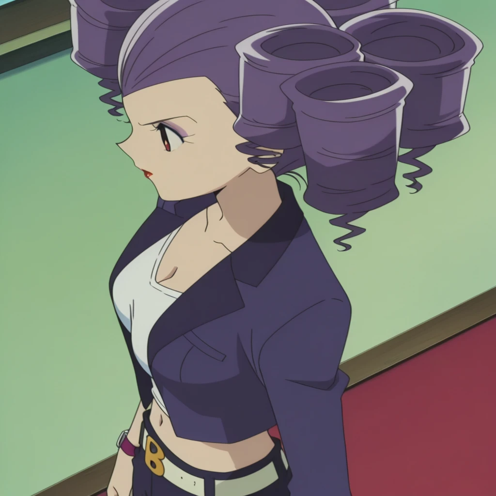 Brookmeyer, red eyes, purple hair, red lips, , large , purple twin drill hair, eye makeup,