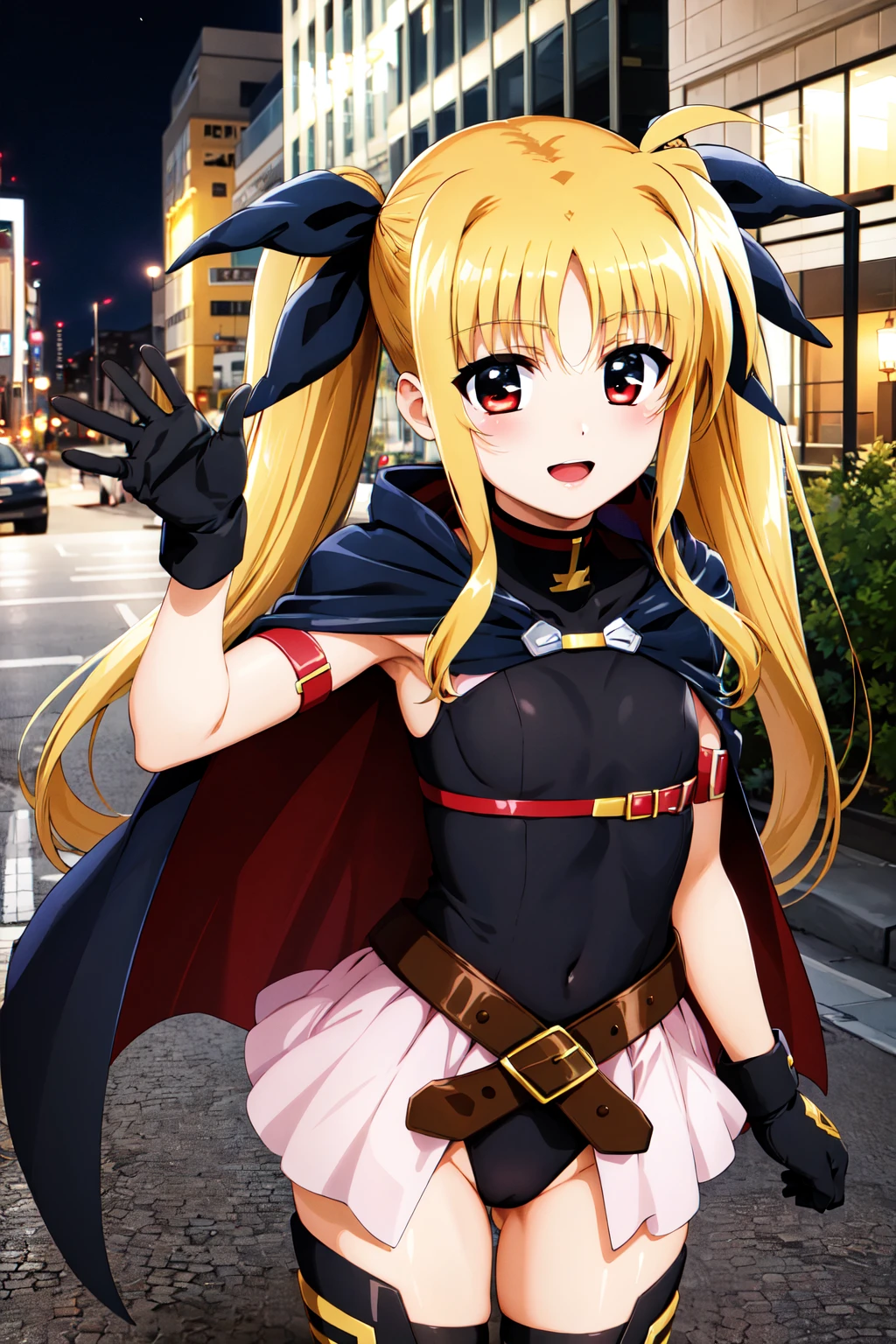 aafate, long hair, twintails, hair ribbon, black ribbon, small breasts, (black leotard:1.2), cape, arm strap, black gloves, loose belt, showgirl skirt, pink skirt, black thighhighs