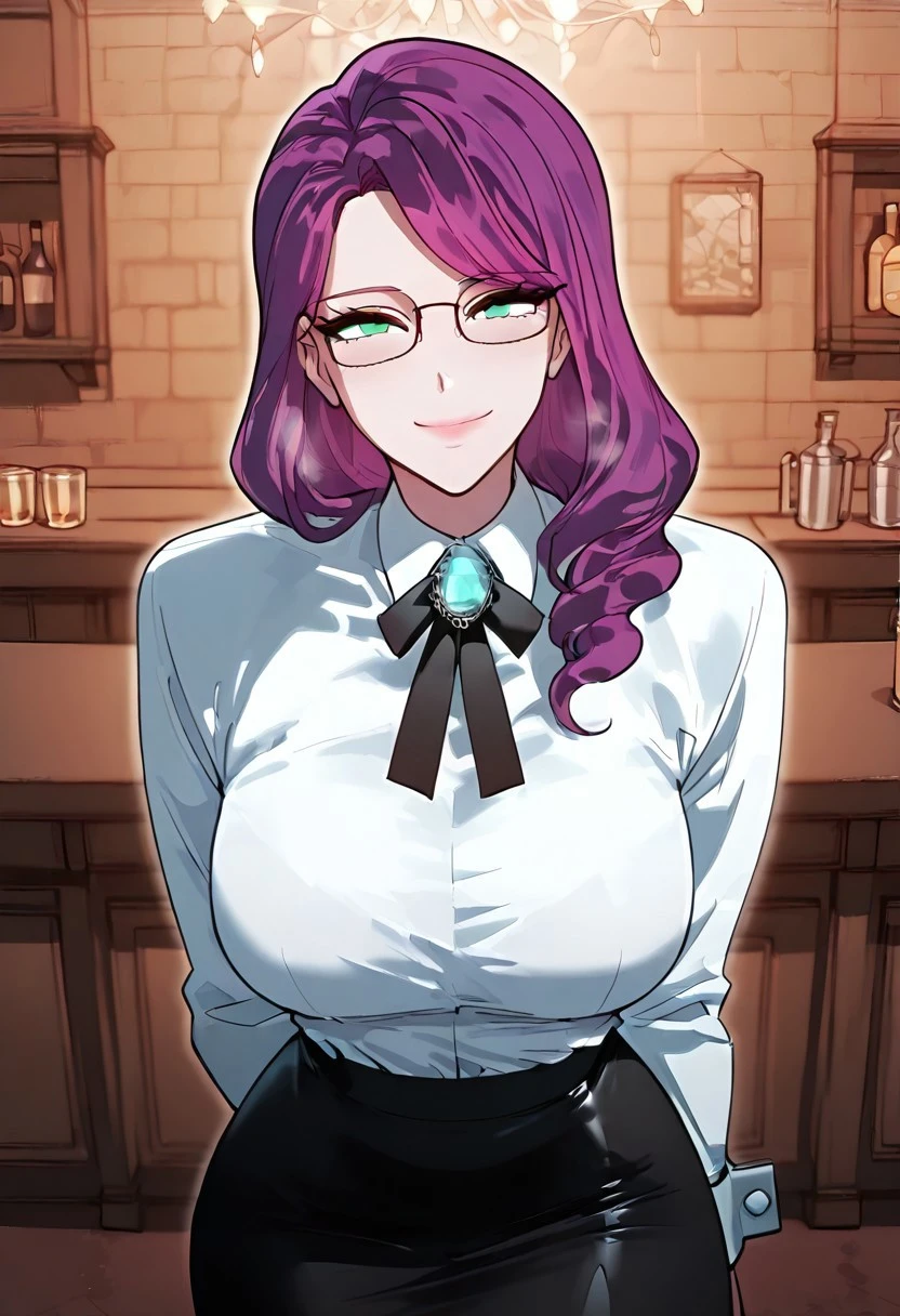 ((black framed glasses, fifitted white blouse with a high collar, black ribbon tie with an ornate accessory which characterized by a large oval light blue gem set within an intricate silver frame, black pencil skirt, white cuffs,
