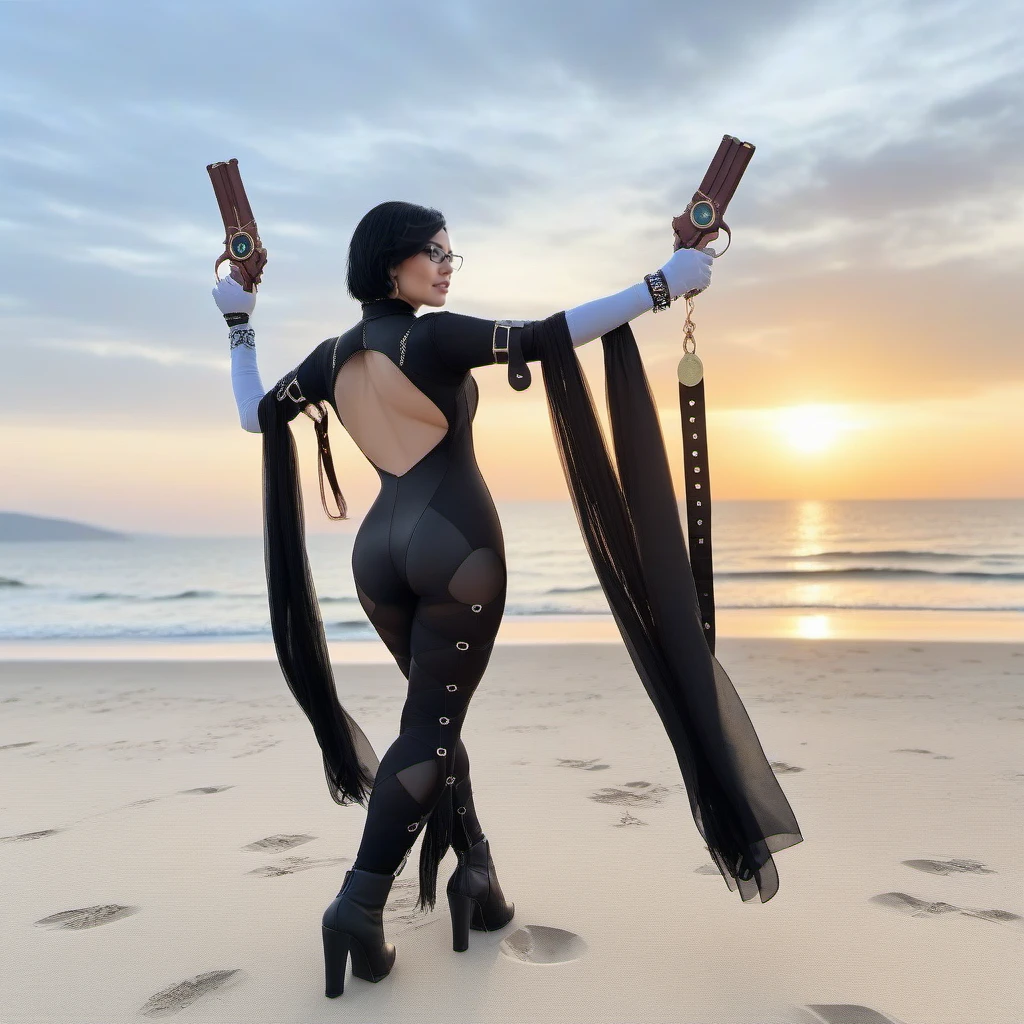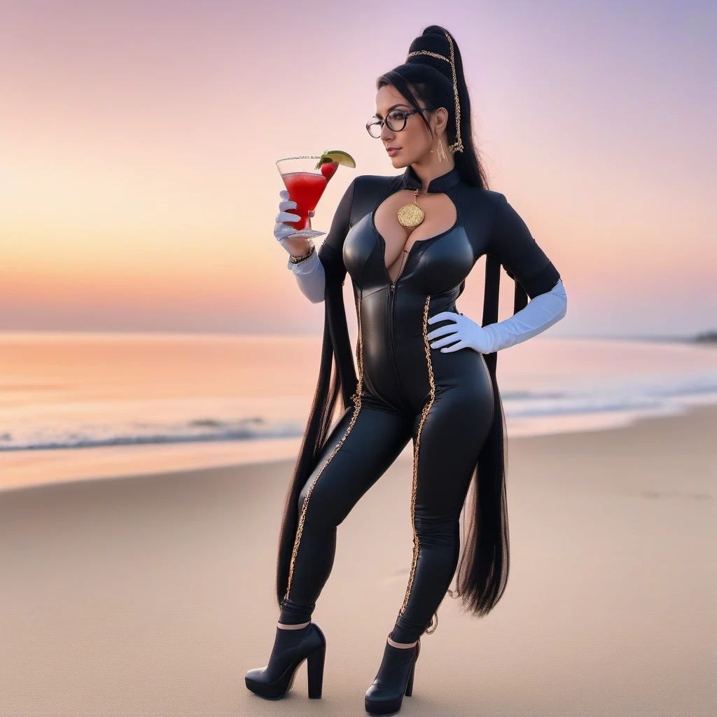 a tall woman, glasses, black long hair, bun on top, jewelry, bodysuit, guns, large breast, gun heels