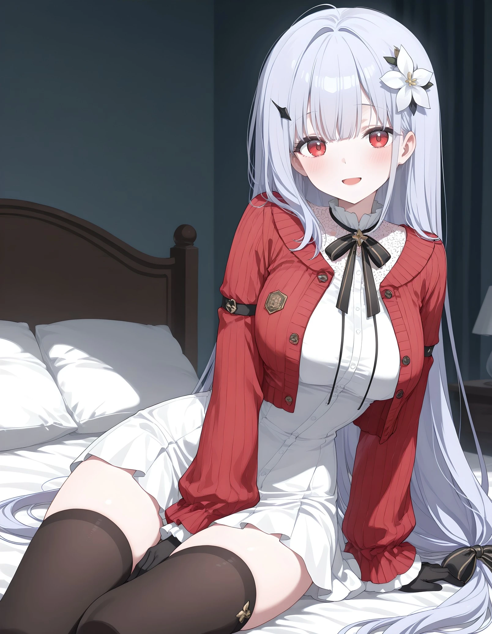 hat,dress,red eyes,long hair,low-tied long hair,cropped red cardigan,hair flower,black thighhighs,black gloves,