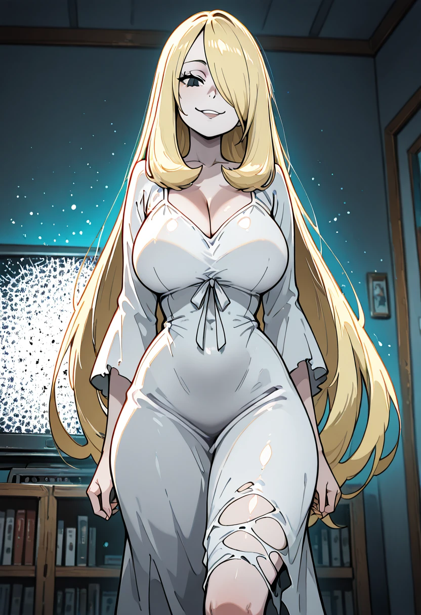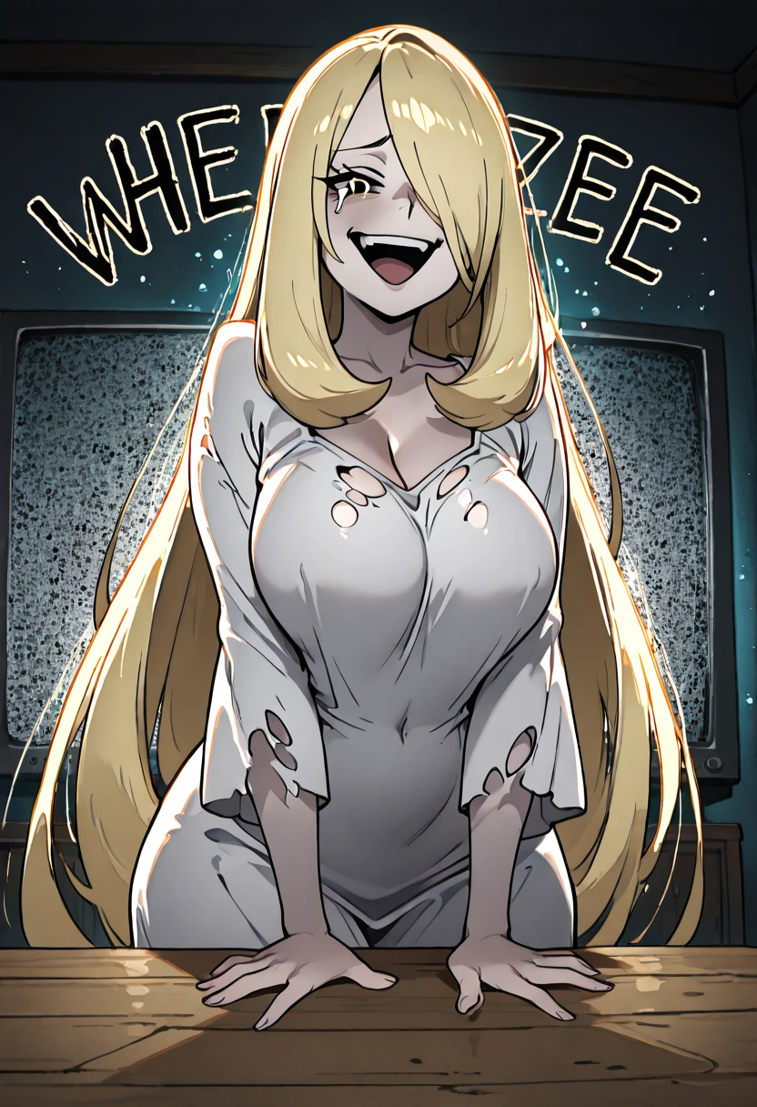 zzCynthiaSadakoCitron, blonde hair, long hair, hair over one eye, horror, oversized clothes, torn clothes, white dress, television, static, glowing, light particles, blurry background,