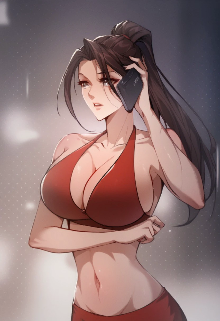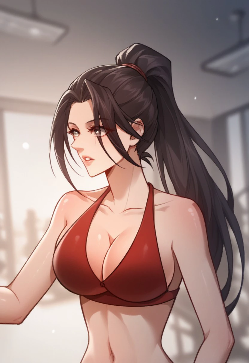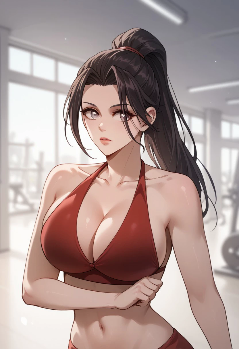 cleavage, halterneck, red sports bra, navel, red shorts, sports shorts,