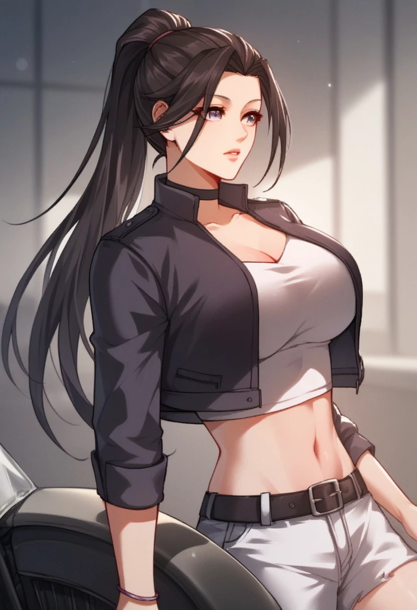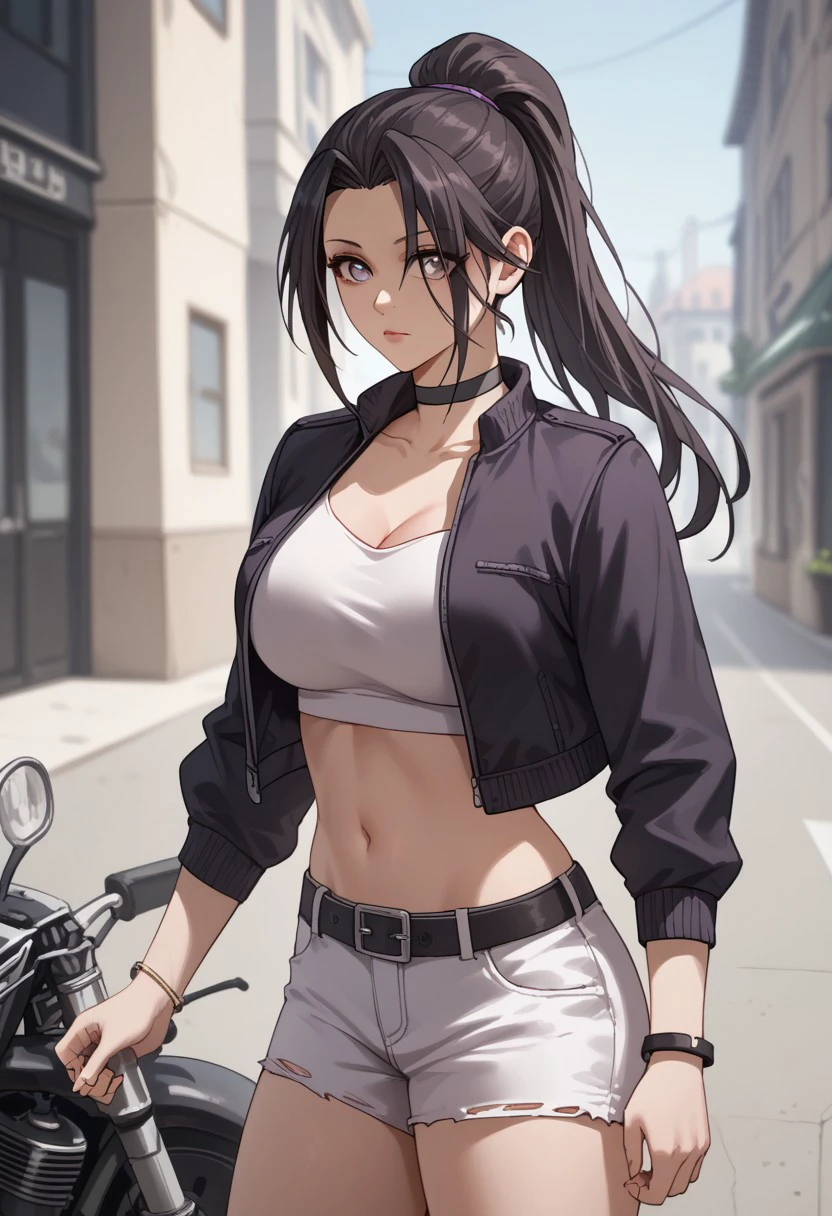 black choker, black jacket, cropped jacket, open jacket, white crop top, midriff, black belt, denim shorts, white shorts, bracelet,
