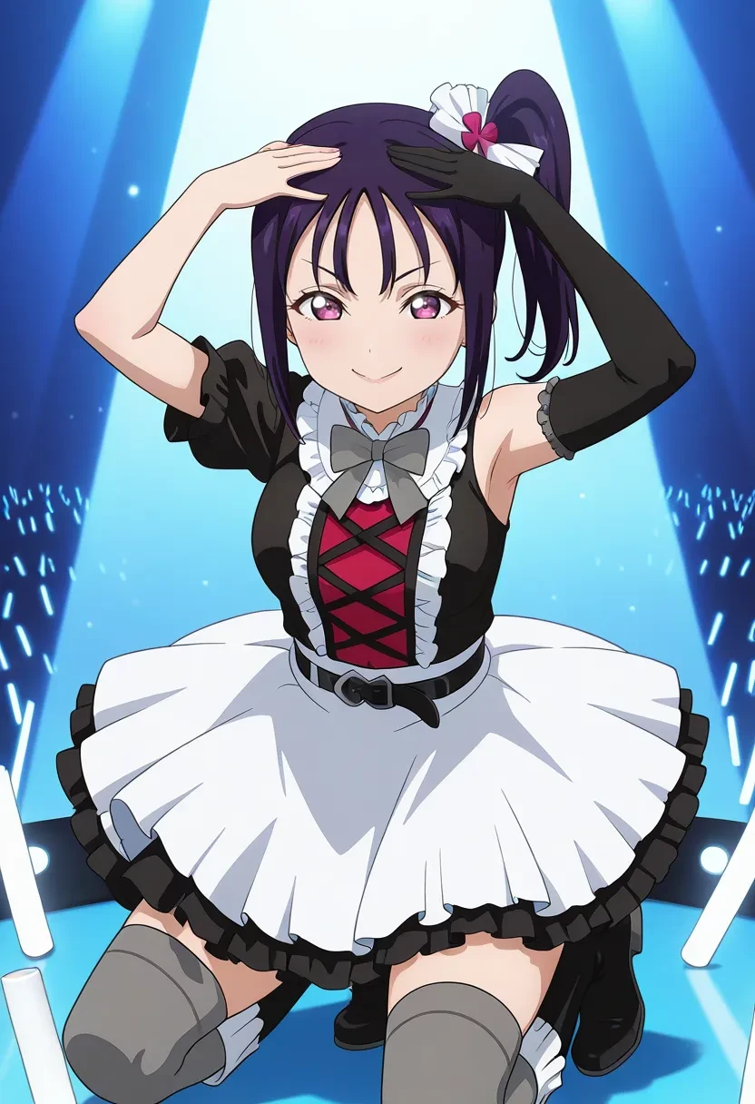 purple hair, long hair, sidelocks, side ponytail, scoutfit, hair ornament frills, grey bowtie, cross-laced clothes, black shirt, white undershirt, single sleeve, puffy short sleeve, single off shoulder,, frilled glove, black glove, single elbow glove, black belt, layered skirt, white skirt, black skirt, grey thighhighs, knee boots, black footwear
