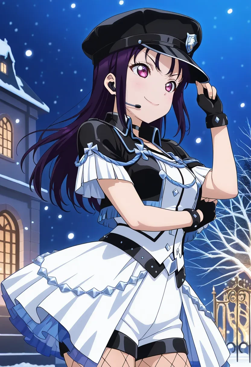 purple hair, long hair, sidelocks, baoutfit, black headwear, peaked cap, headset, black choker, cropped jacket, fringe trim, aiguillette, black jacket, white shirt, short sleeves, short shorts, black shorts, white skirt, showgirl skirt, see-through skirt, black gloves, fingerless gloves, fishnet pantyhose, knee boots, black footwear