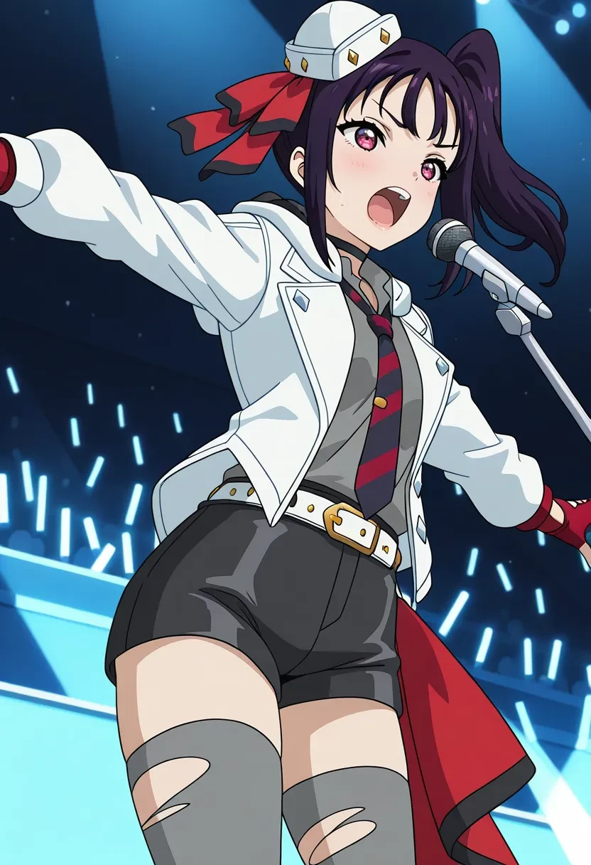 purple hair, long hair, sidelocks, side ponytail, dooutfit, mini hat, white headwear, hat ribbon, red ribbon, striped necktie, black choker, white jacket, hooded jacket, grey shirt, red gloves, fingerless gloves, white belt, black shorts, short shorts, grey thighhighs, torn thighhighs, boots, white footwear