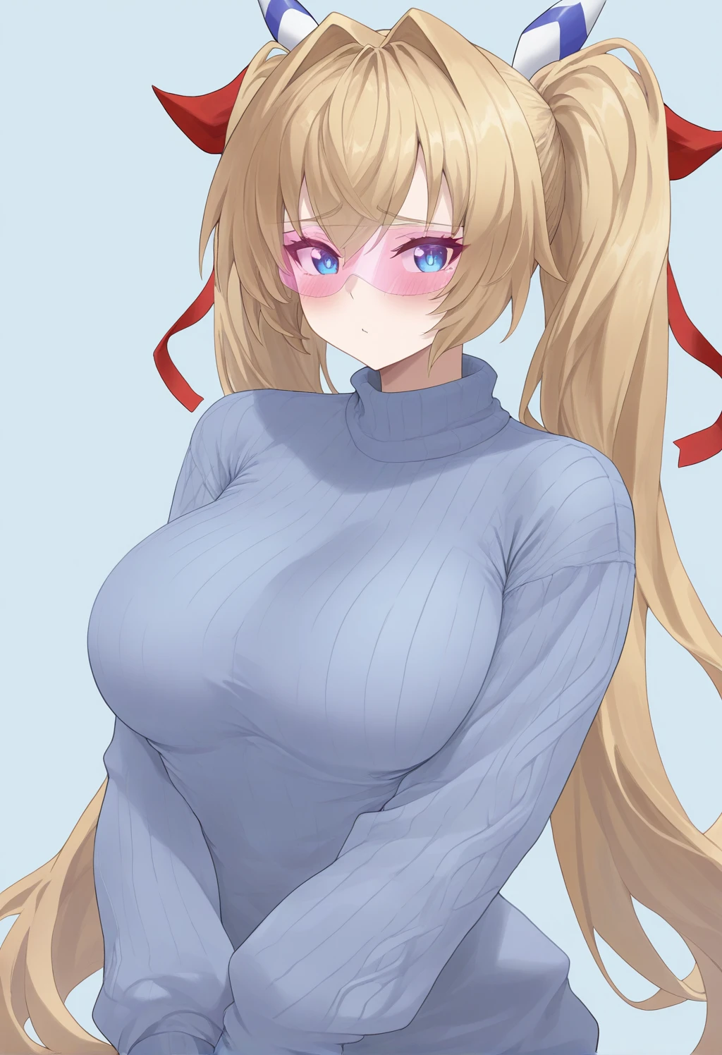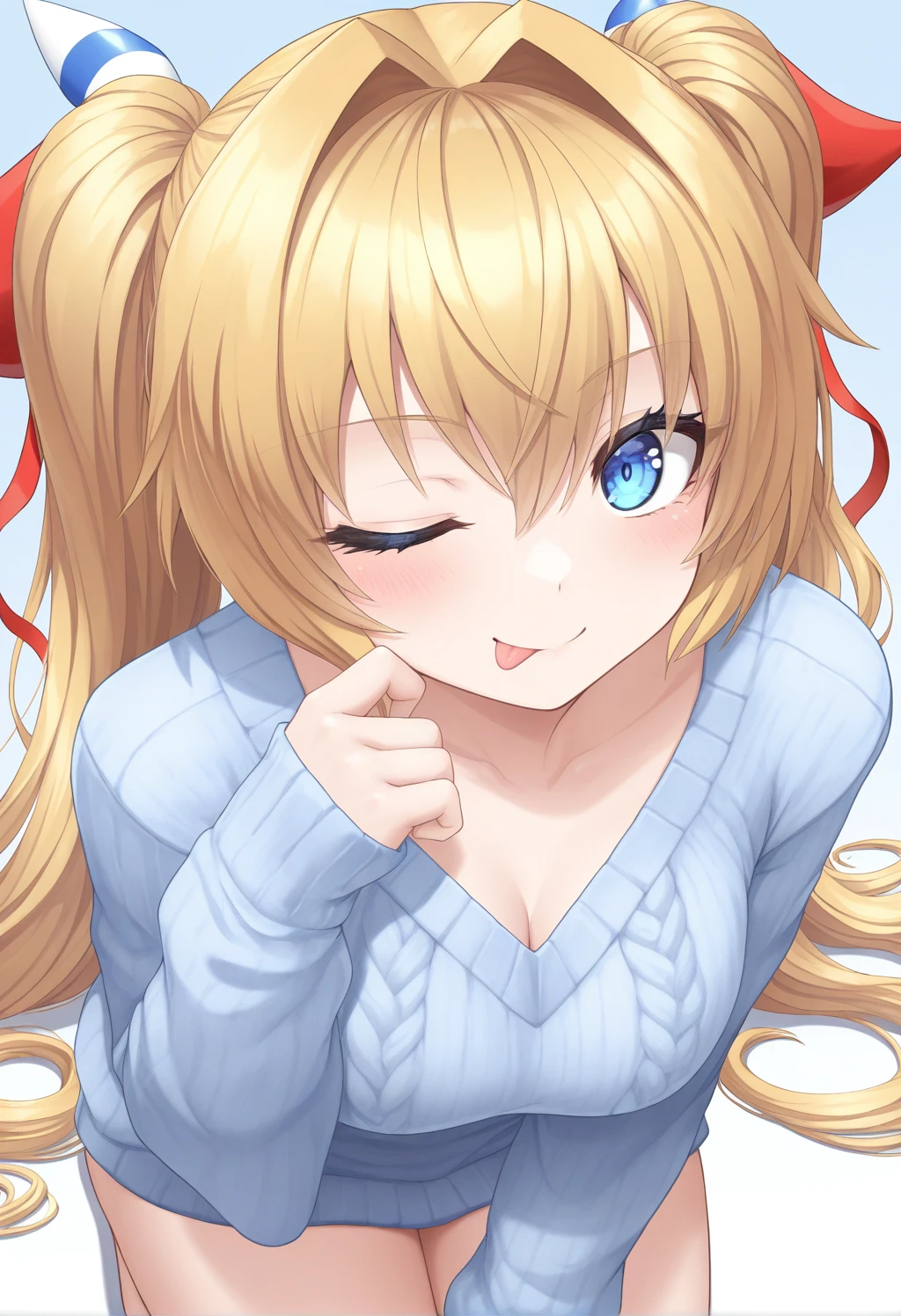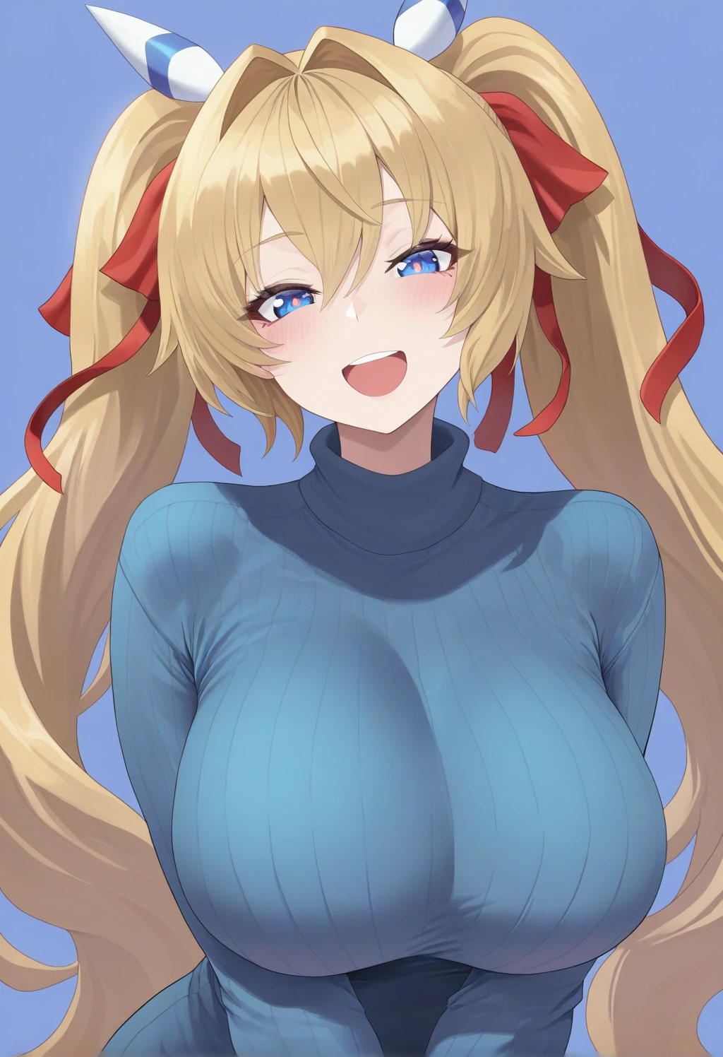 Appearance: Shine Mirage, blonde hair, long hair, very long hair, bangs, twintails, hair intakes, blue eyes, large breasts