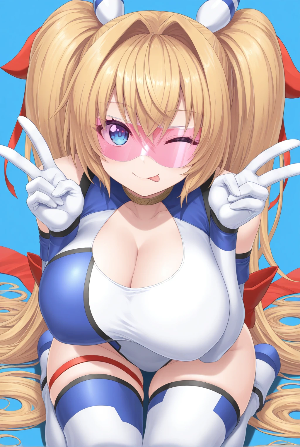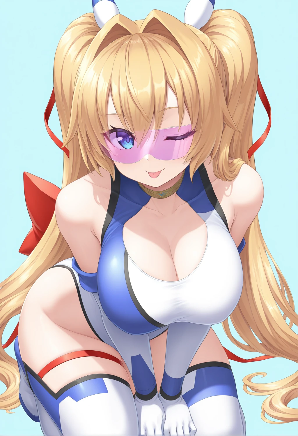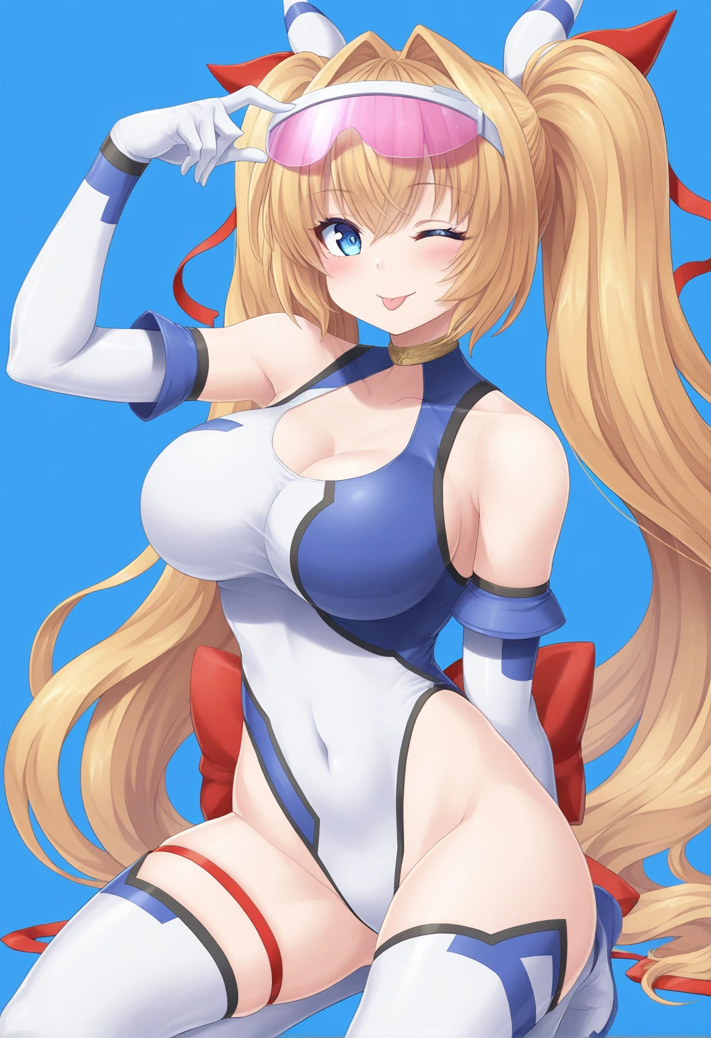 Striker Outfit: visor, purple-tinted eyewear, blue striped hair ornament, red ribbon, hair ribbon, choker, clothing cutout, bare shoulders, asymmetrical leotard, highleg leotard, elbow gloves, white gloves, red back bow, white thighhighs, thigh boots