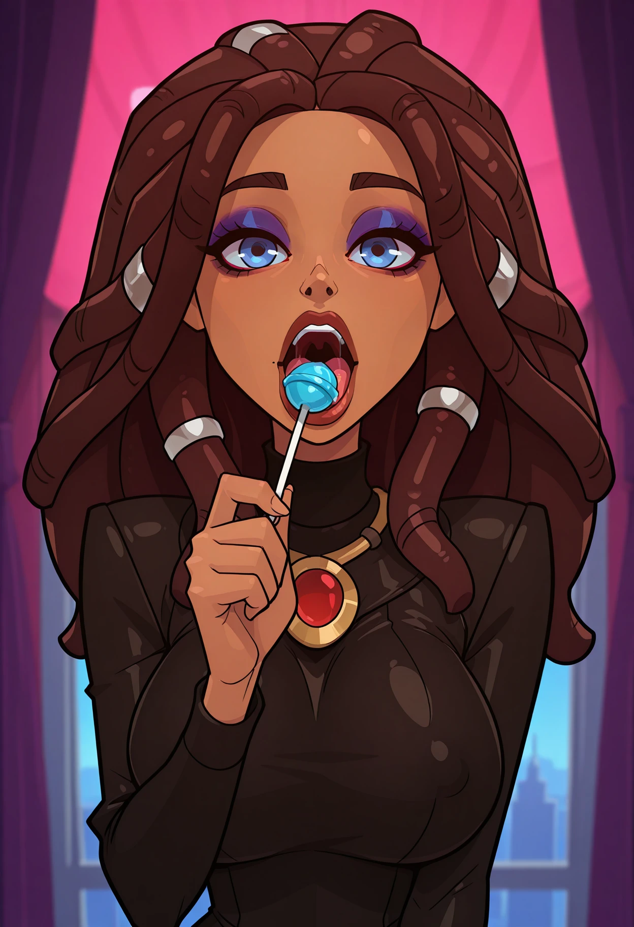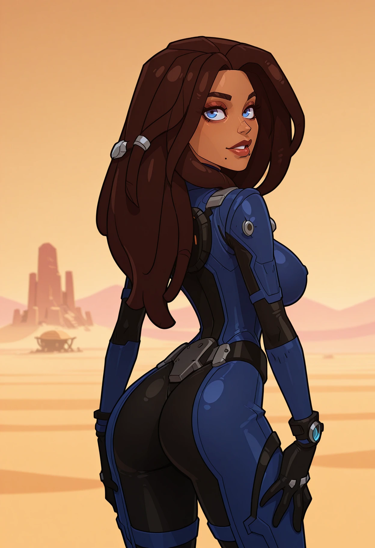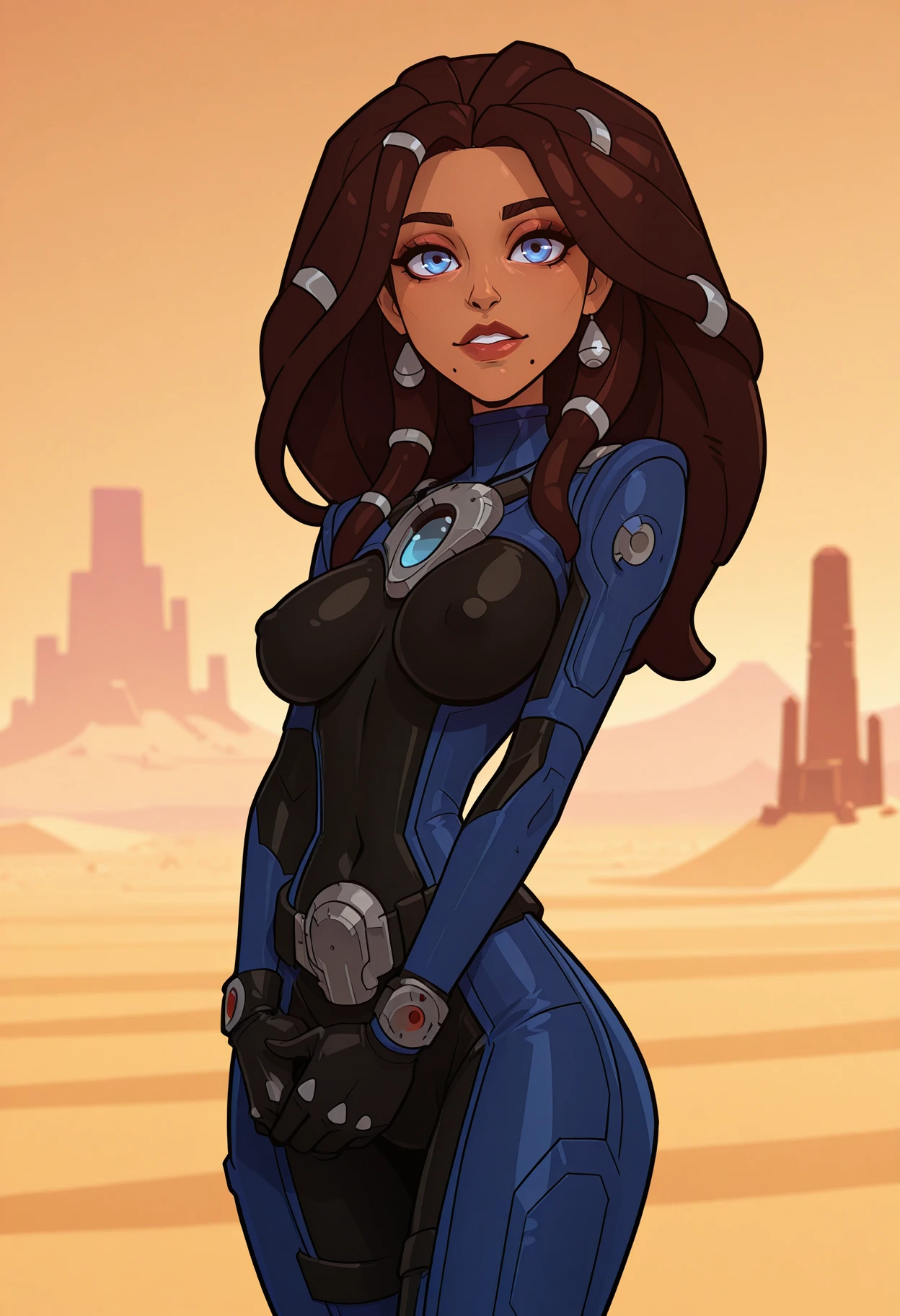 recommended tags: mole under mouth, breasts, long hair, dark skin, dark-skinned female, bodysuit, mole, makeup, brown hair, dreadlocks, lips,