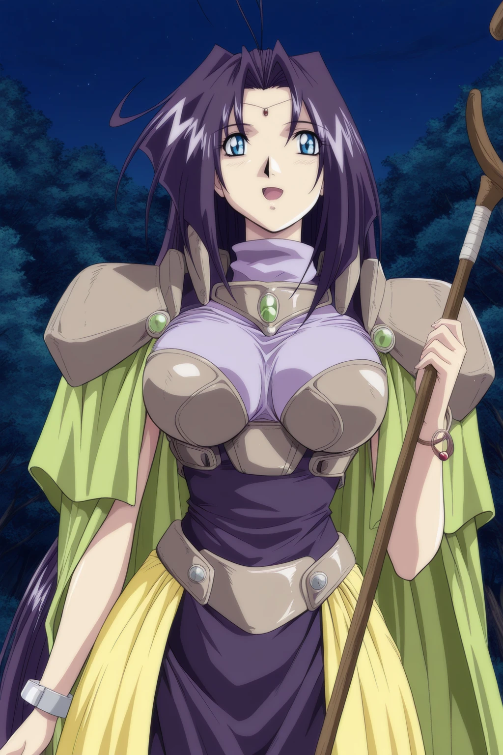 izyi Fortuna,game cg,Cynthia Woodword,1girl,solo,purple hair,long hair,antenna hair,blue eyes,large breasts,circlet,jewelry,edge strip shoulder armor,green cape,breastplate,light purple turtleneck clothing,yellow waist cape,bracelet,boots,staff,holding staff,holding,