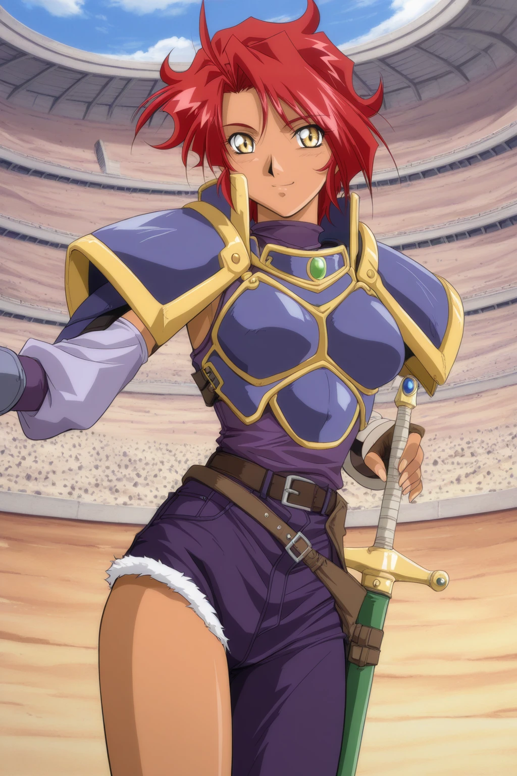 izyi Fortuna,game cg,Aina Wilson,1girl,solo,armor,red hair,short hair,yellow eyes,breasts,blue armor,shoulder armor,asymmetrical clothes,breastplate,pauldrons,purple turtleneck top,blue elbow gloves,detached sleeves,brown gloves,fingerless gloves,belt,long purple single pantsleg,short boots,denim,sheath,weapon,sword,holding,holding weapon,holding sword,