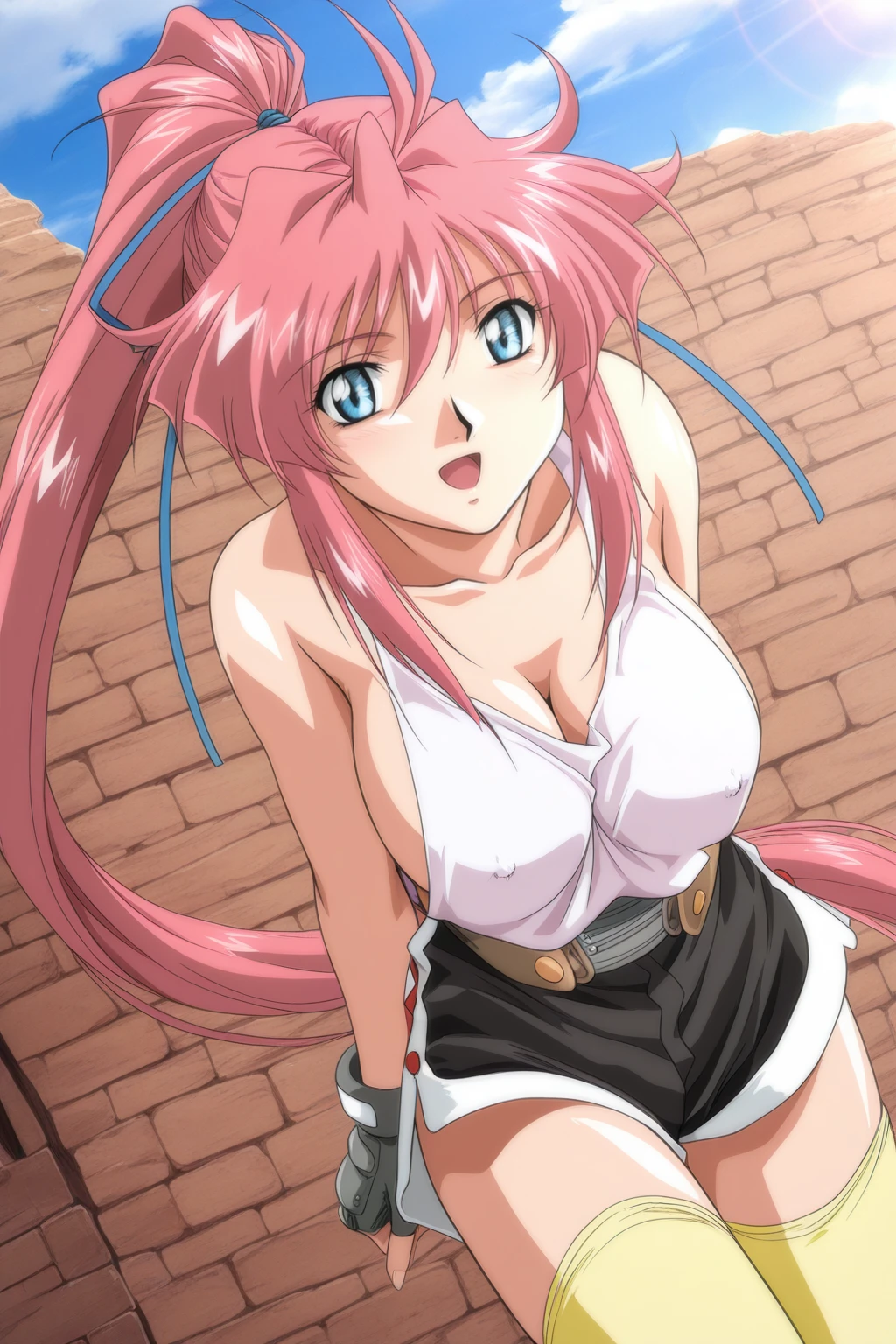 izyi Fortuna,game cg,Rena Wicks,1girl,solo,pink hair,blue eyes,long hair,ponytail,hair ribbon,large breasts,bare shoulders top,collarbone,sideboob,covered nipples,no bra,fingerless gloves,black shorts,yellow thighhighs,short boots,