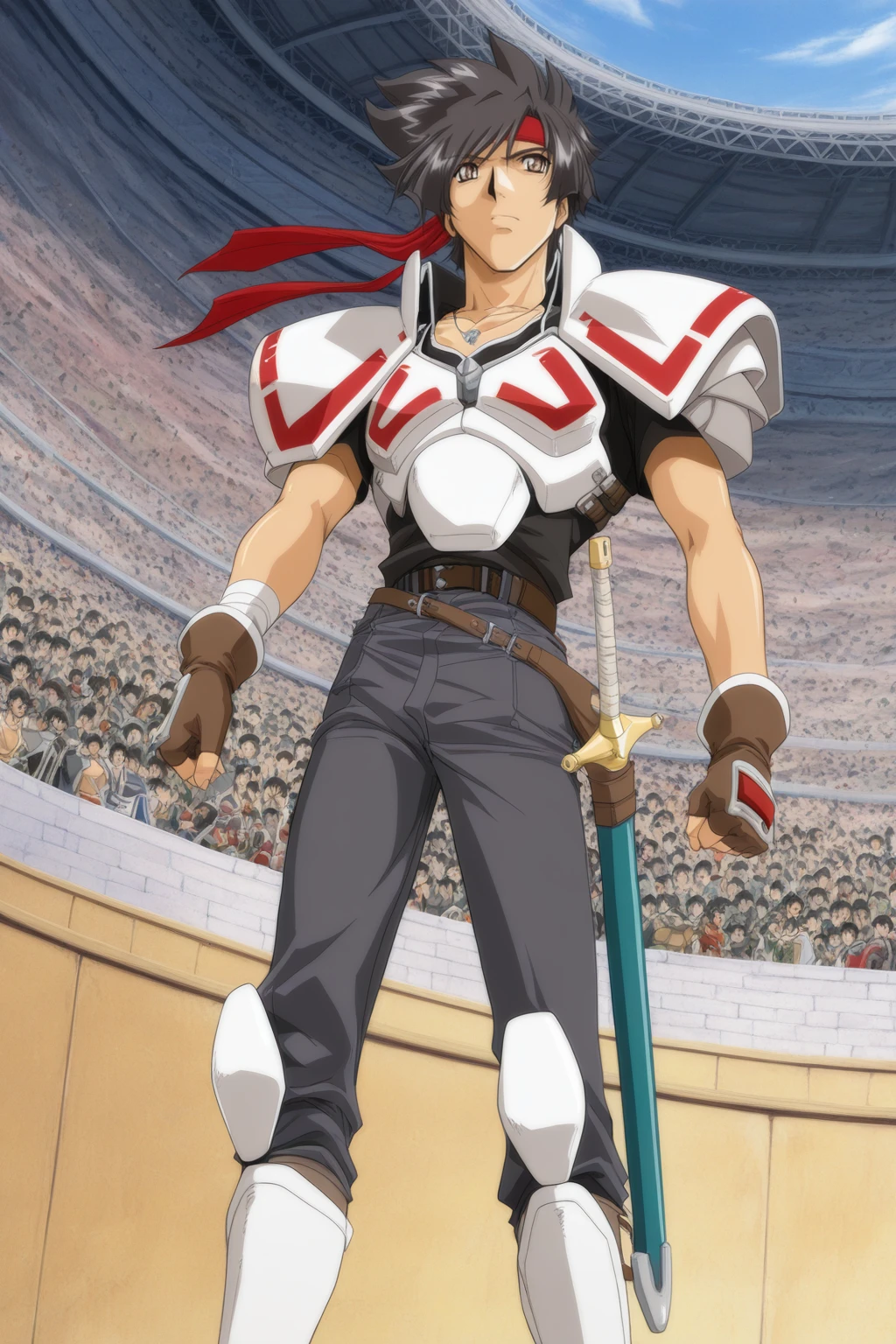 izyi Fortuna,game cg,Lal'C,1boy,solo,black hair,spiked hair,brown eyes,red headband,necklace,white armor,shoulder armor,breastplate,brown gloves,fingerless gloves,belt,pants,armor boots,weapon,sword,sheathed,scabbard,sheath,