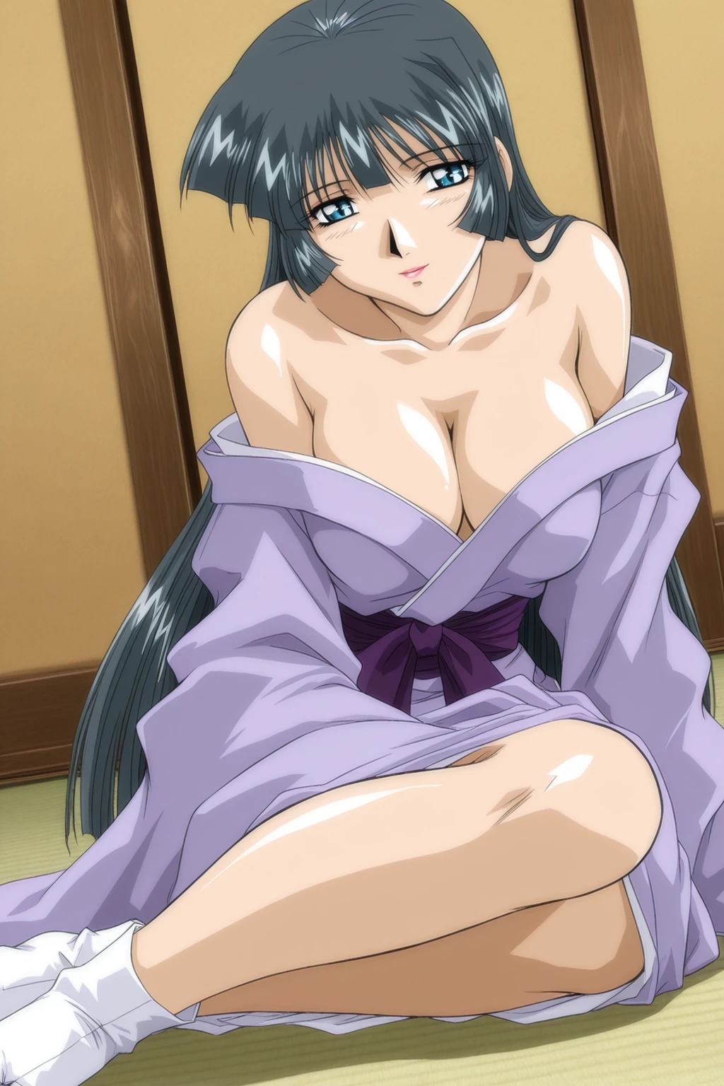 izyi Fortuna,game cg,Aika Bianchi,1girl,solo,black hair,long hair,bangs,blue eyes,makeup,lipstick,large breasts,cleavage,japanese clothes,purple kimono,bare shoulders,off shoulder,tabi socks,