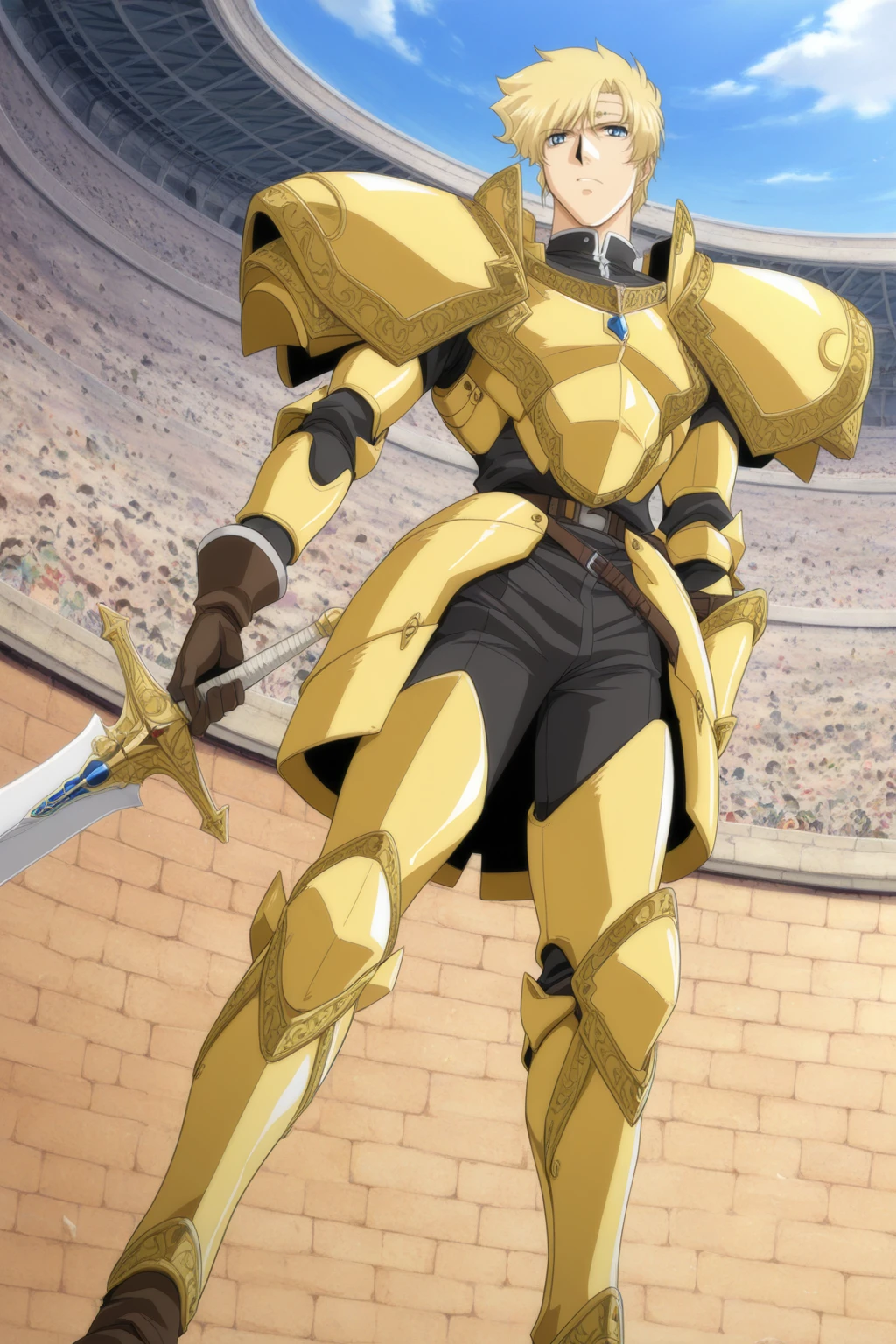 izyi Fortuna,game cg,Alec,1boy,solo,blonde hair,short hair,blue eyes,circlet,armor,gold armor,shoulder armor,wrist armor,full armor,gloves,shin guards,boots,weapon,sword,holding weapon,holding,holding sword,