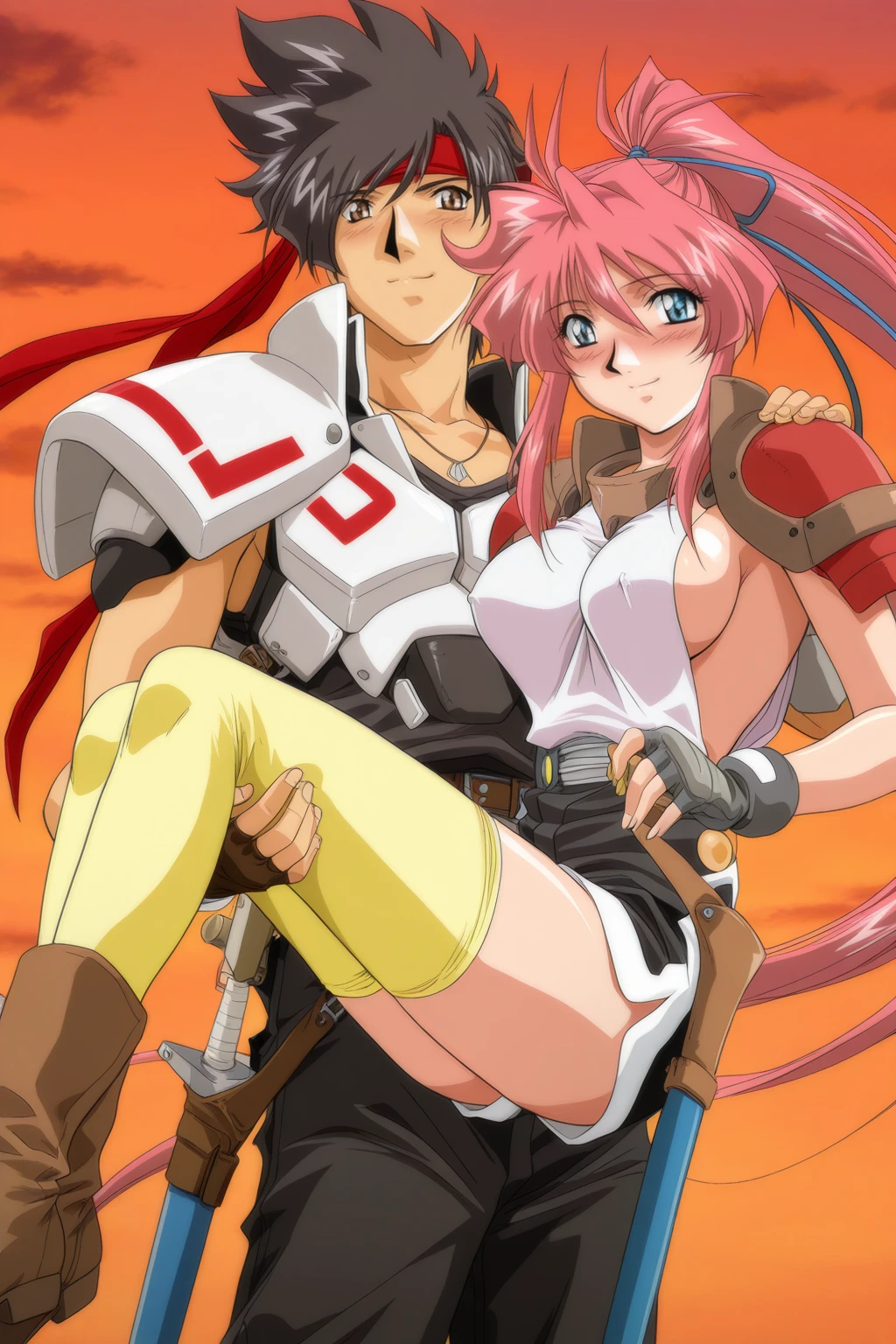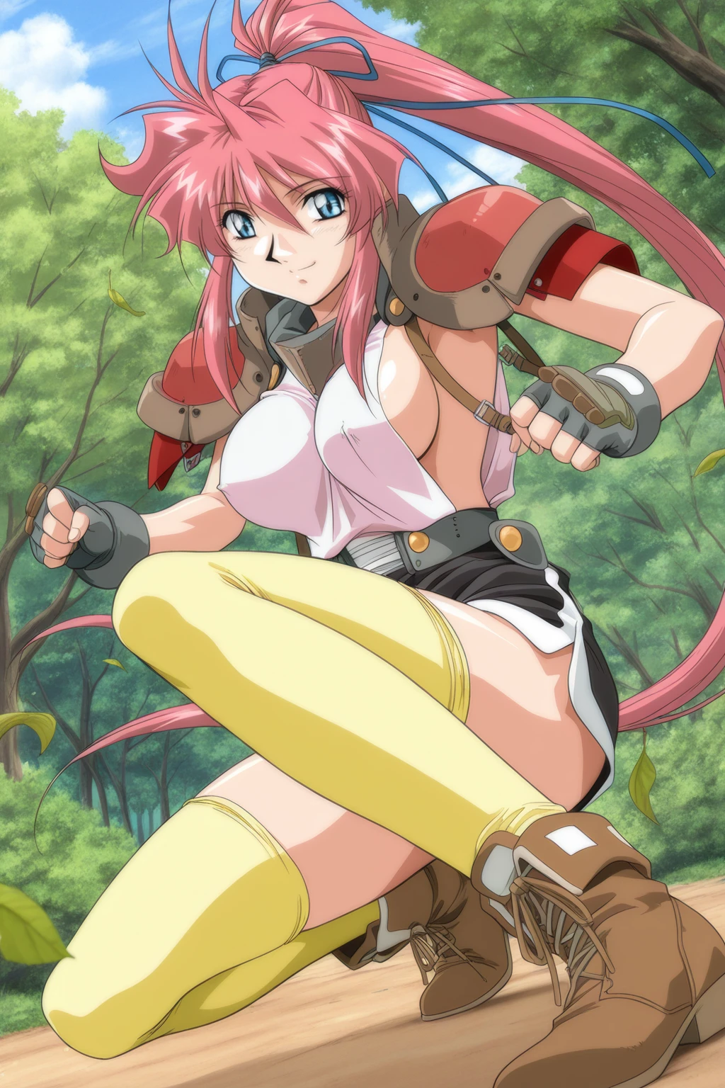 izyi Fortuna,game cg,Rena Wicks,1girl,solo,pink hair,blue eyes,long hair,ponytail,hair ribbon,large breasts,armor,pauldrons,shoulder armor,shoulder pads,sideboob,covered nipples,no bra,fingerless gloves,black shorts,yellow thighhighs,short boots,