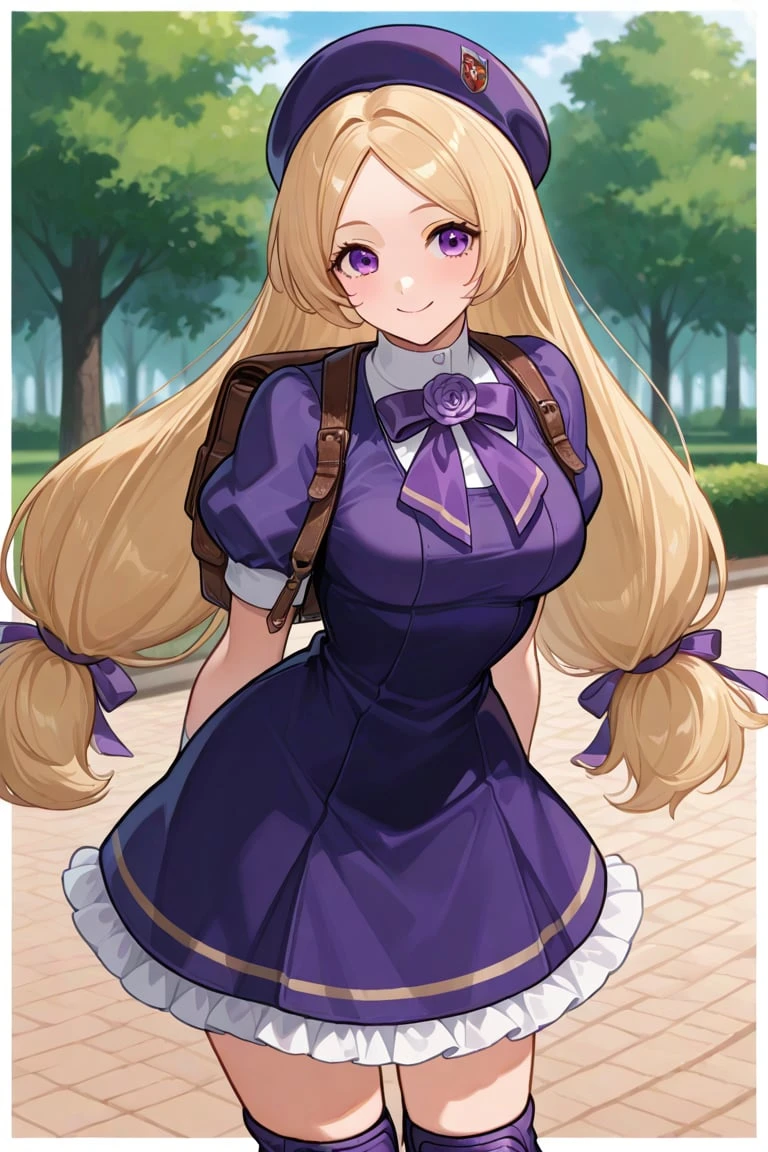 purple beret, purple dress, tight clothes, puffy sleeves, white frills, gold trim, bow, purple flower bow, knee pads, purple knee pads, black boots, short white socks, red laces, bandaged fingers