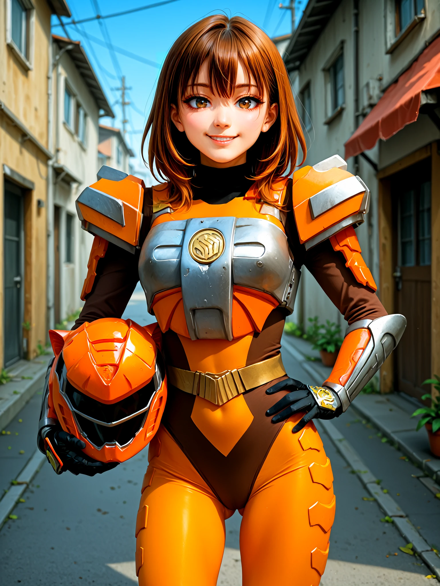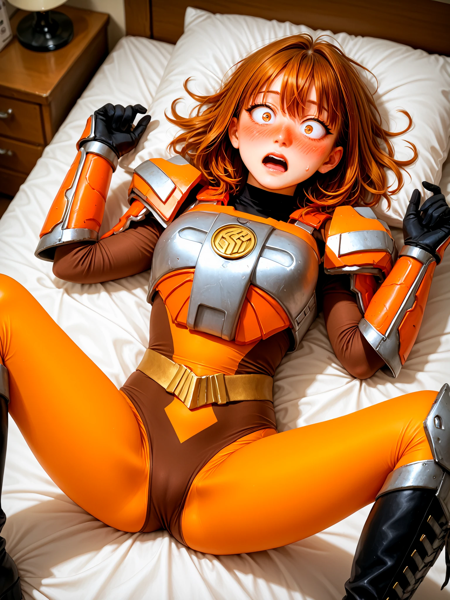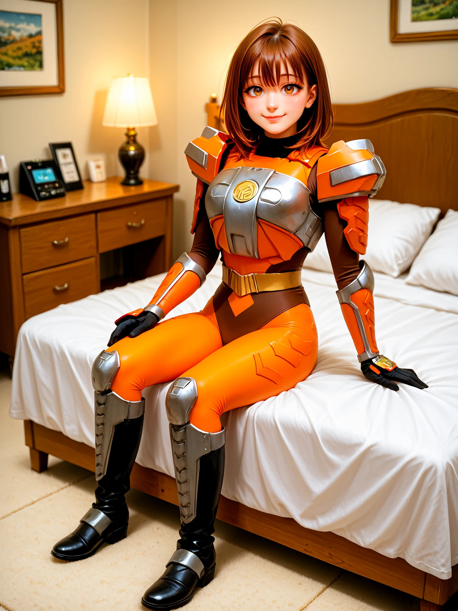 sazervisuel, orange bodysuit, brown leotard, belt, armor, gauntlets, black glovesAdd if doing "full body" or "feet out of frame" (training data set had "boots" as prompt, but from my own testing, "knee boots" seem to get you a more accurate depiction of her boots including her silver knee guards):