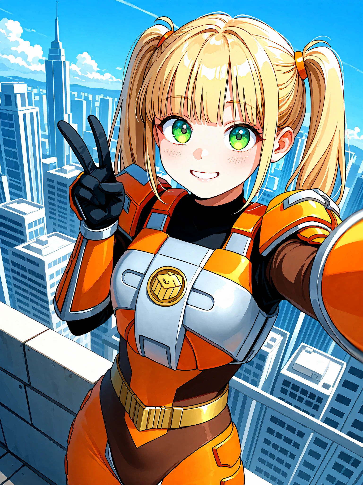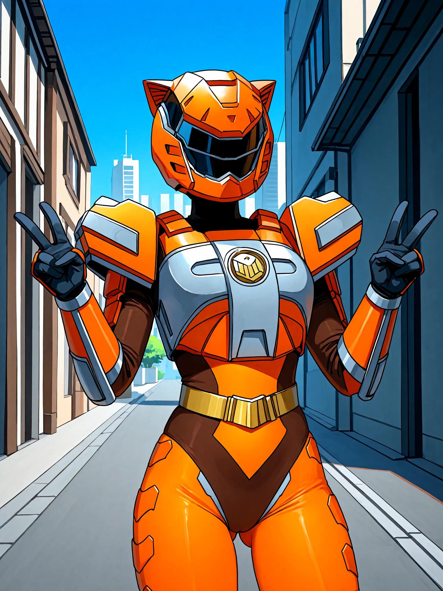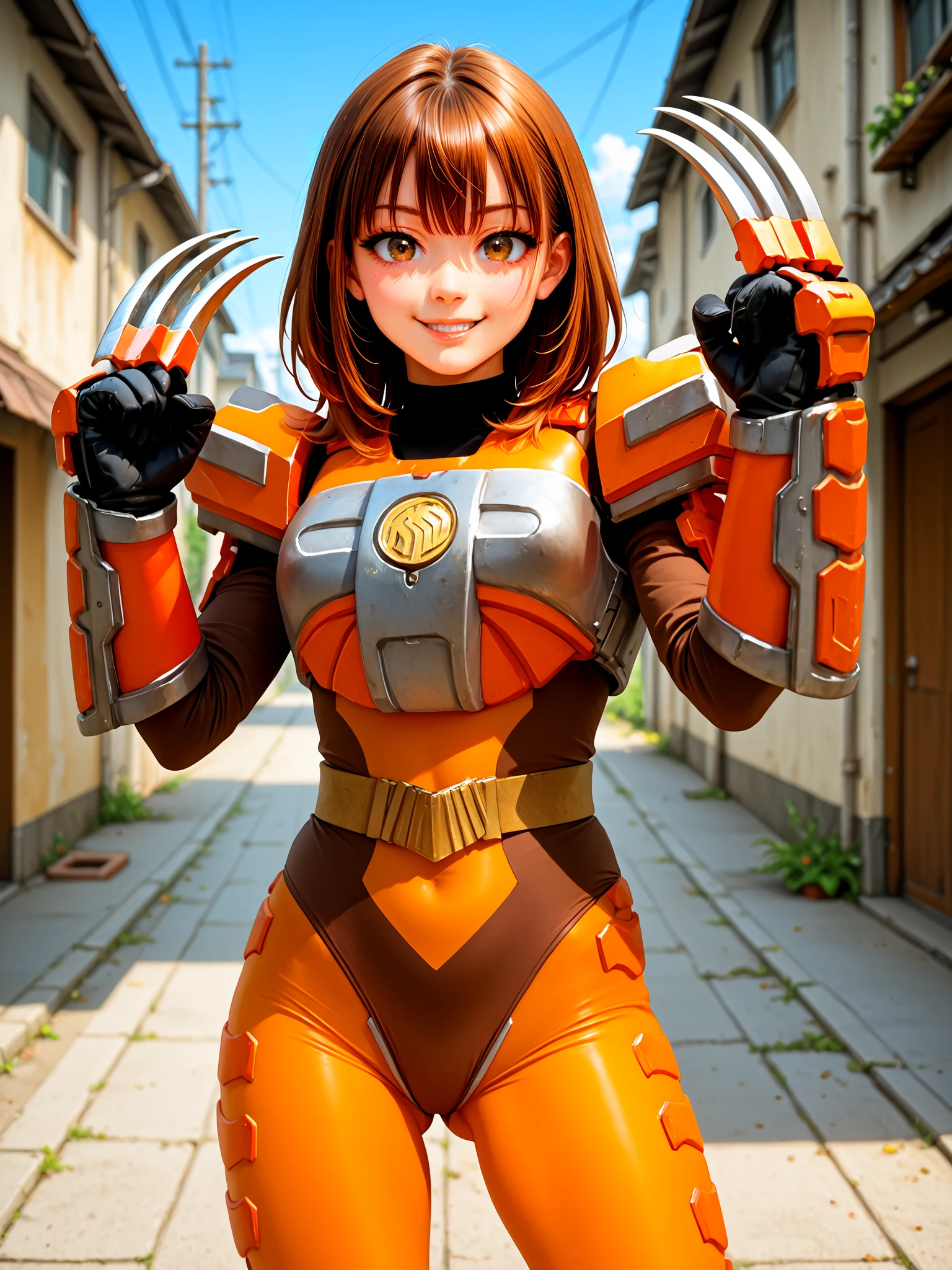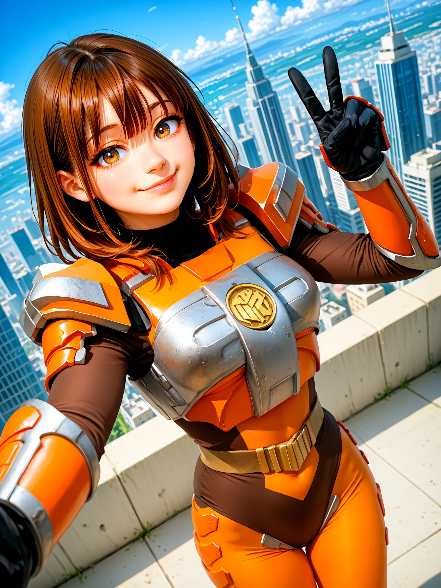 sazervisuel, orange bodysuit, brown leotard, belt, armor, gauntlets, black glovesAdd if doing "full body" or "feet out of frame" (training data set had "boots" as prompt, but from my own testing, "knee boots" seem to get you a more accurate depiction of her boots including her silver knee guards):