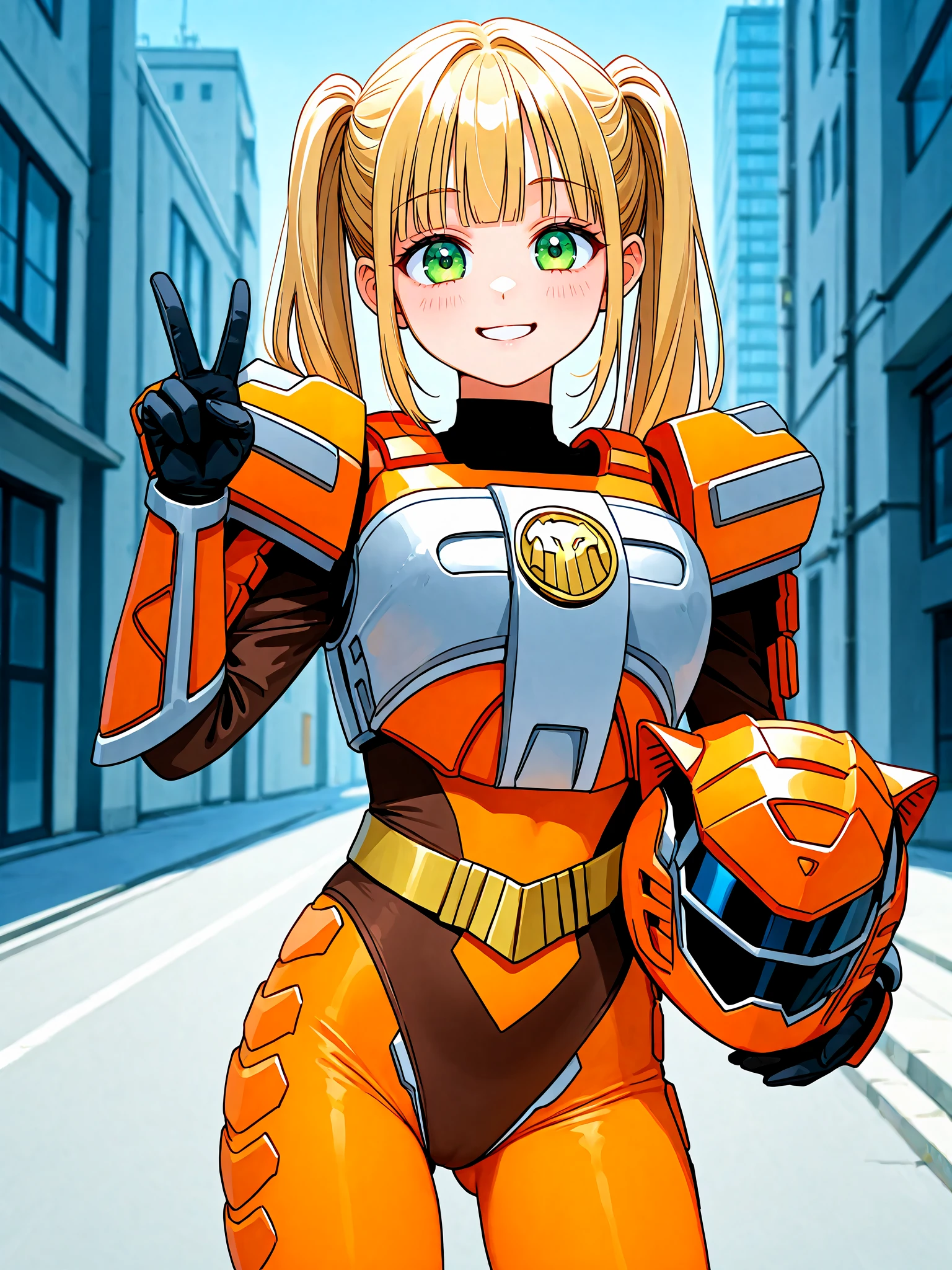 helmet, wearing helmet, [eye color prompts], [facial expression prompts]For helmet to be held and not worn: