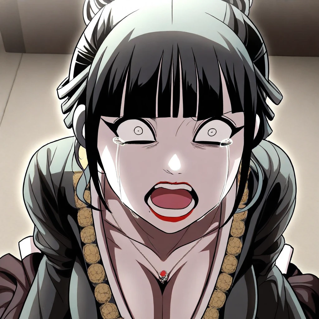 white skin, sharp jawline, high cheekbones, small straight nose, mole under mouth, makeup, red lips, black eyeliner, long eyelashes, thin arched eyebrows, blunt bangs, black hair, high bun, side bangs, wrapped fabric hair accessory,