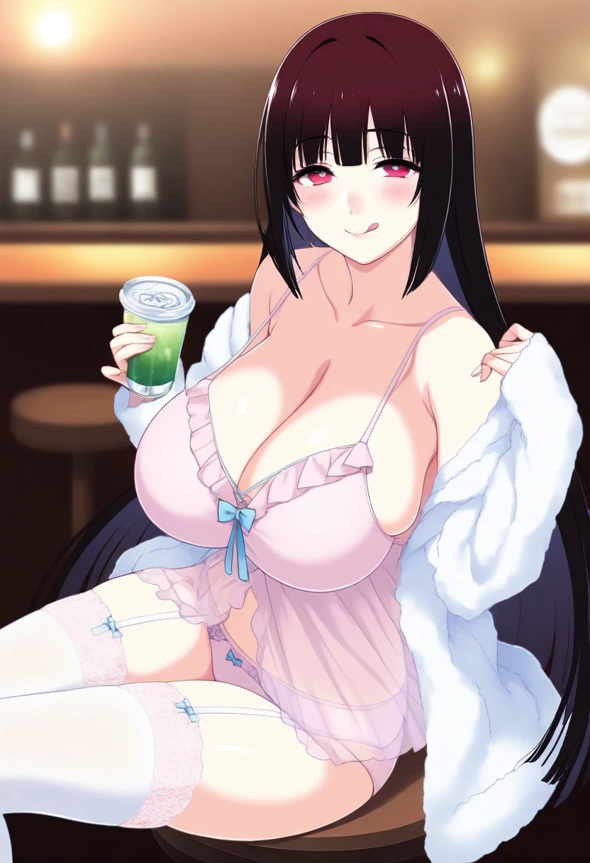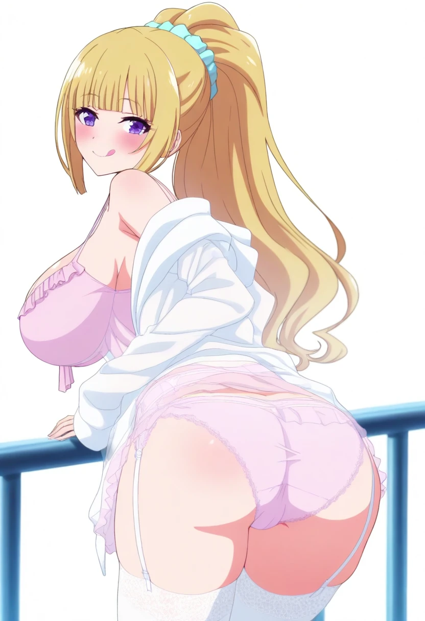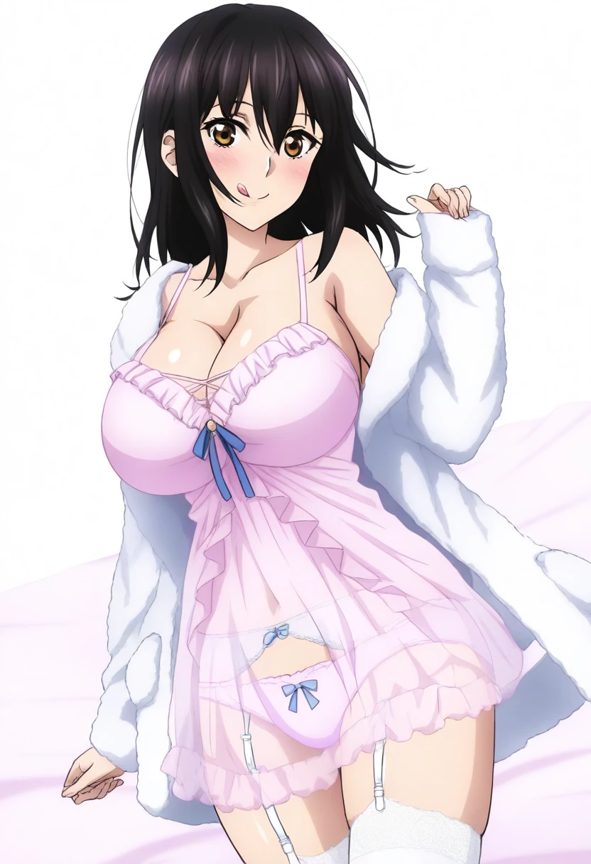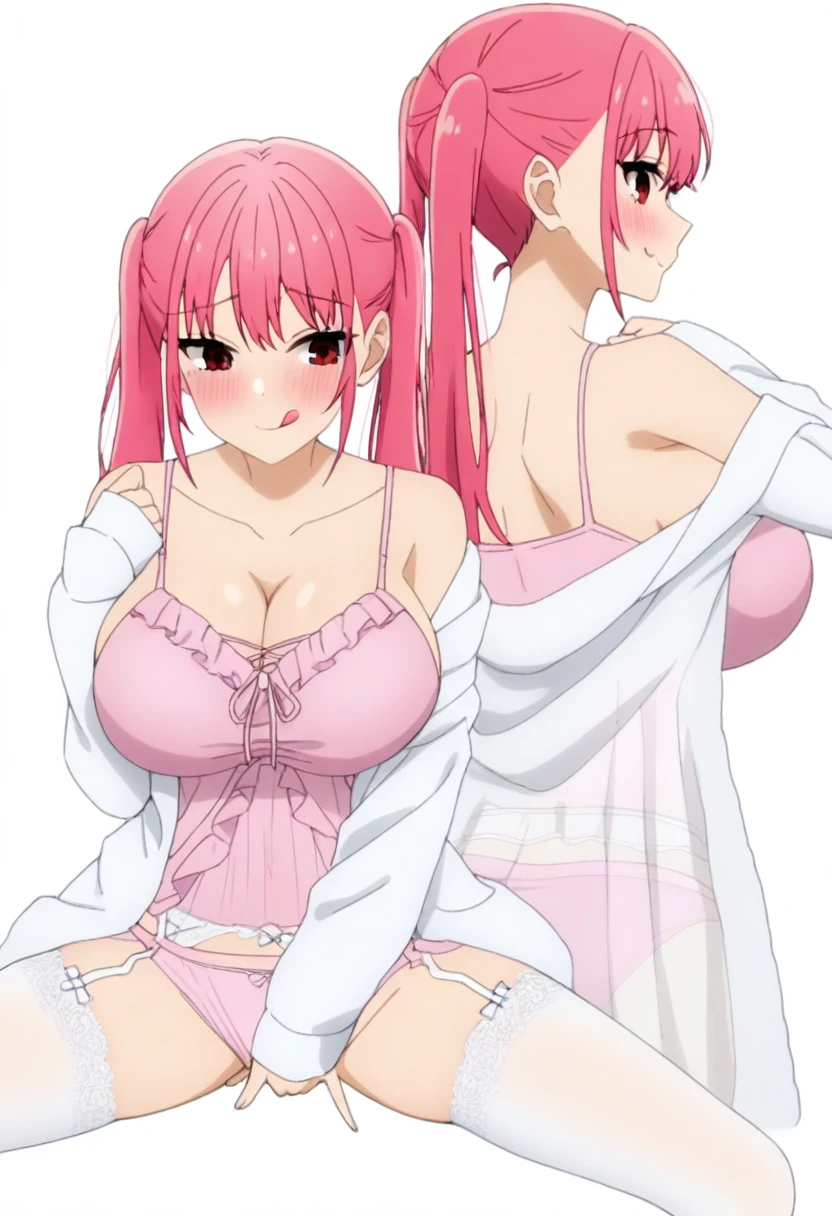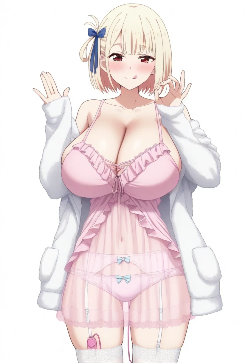 <lora:bena_aemrpa_tenoaj_mnvua24:0.8>, camisole,nightgown, white jacket, underwear,lingerie, bena_aepa_teaj_mua5, garter straps,garter belt, pink panties, white thighhighs, frills, lace trim, , , see-through,long sleeves,sleeves past wrists, cleavage,collarbone,off shoulder, bare shoulders, bow, blue bow,