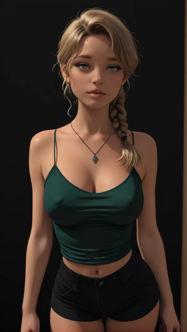 rtmepilogue_mia, blonde hair, blue eyes, lips, medium breasts, ponytail, braid, wavy hair, lipstick, eyeliner, green tank top, low-cut neckline, spaghetti straps, cleavage, midriff, black shorts, short shorts, necklace