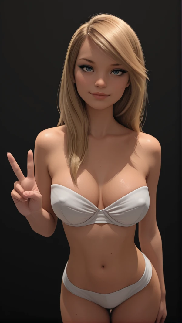 white bikini top, white bikini bottoms, strapless top, cleavage, low-waist bottoms