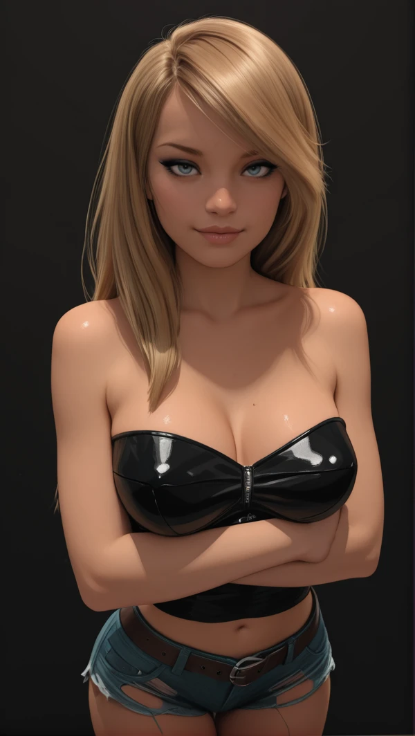 black tube top, cleavage, midriff, denim shorts, microshorts, torn shorts, black leather belt, unbuckled belt