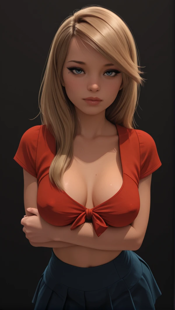 front-tied blouse, cropped blouse, short sleeves, plunge neckline, midriff, red blouse, blue skirt, microskirt, pleated