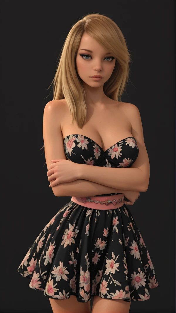strapless dress, sleeveless, bare shoulders, cleavage, black dress, floral, multicolored flowers, mauve flowers, mauve waistband, ribbon waistband, mauve hem, short dress