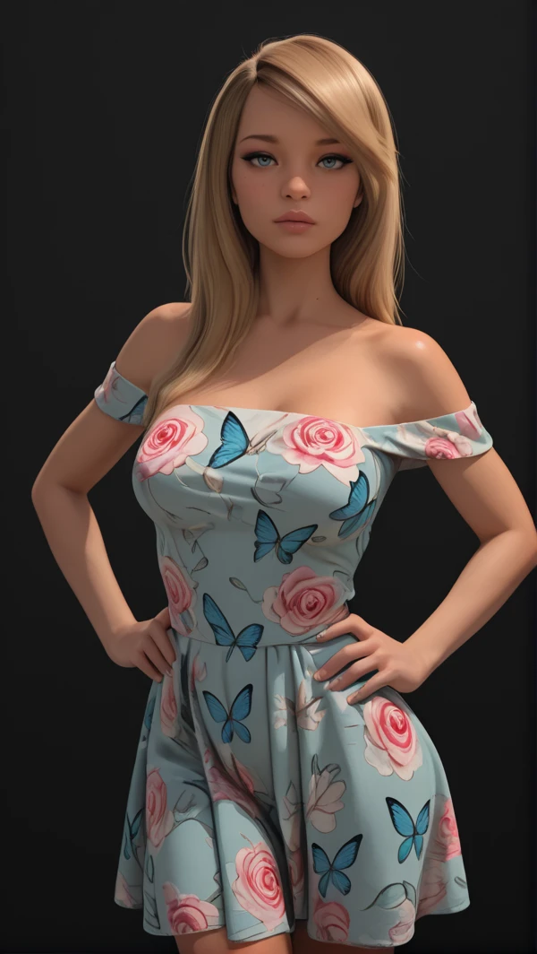 off-shoulder dress, floral, pink roses, orange roses, blue butterflys, bare shoulders, short dress