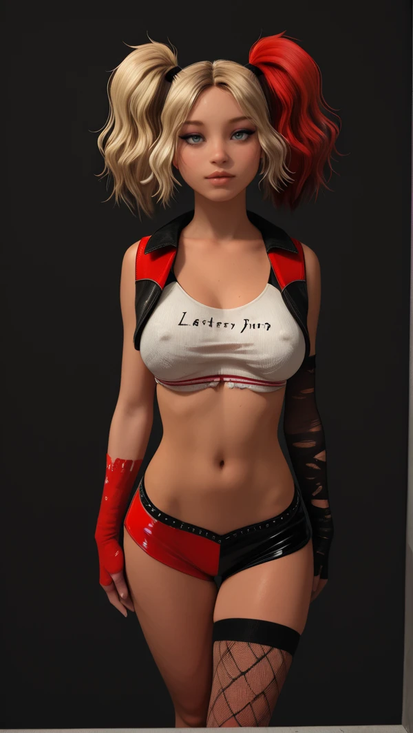 rtm_mia, blue eyes, lips, parted bangs, high twintails, messy hair, multicolored hair, blonde hair, red hair, blonde twintail, red twintail, medium breasts, lipstick, eyeliner, winged eyeliner, eyeshadow, harley quinn outfit, cropped vest, sleeveless, cropped tank top, tattered top, multicolored top, white top, black top, multicolored vest, black vest, red vest, fingerless gloves, sleeve gloves, black glove, red glove, tattered gloves, midriff, microshorts, multicolored shorts, red shorts, black shorts, low-waist shorts, high-cut leg shorts, glossy shorts, single thighhigh, asymmetrical legwear, fishnet thighhigh, torn fishnet