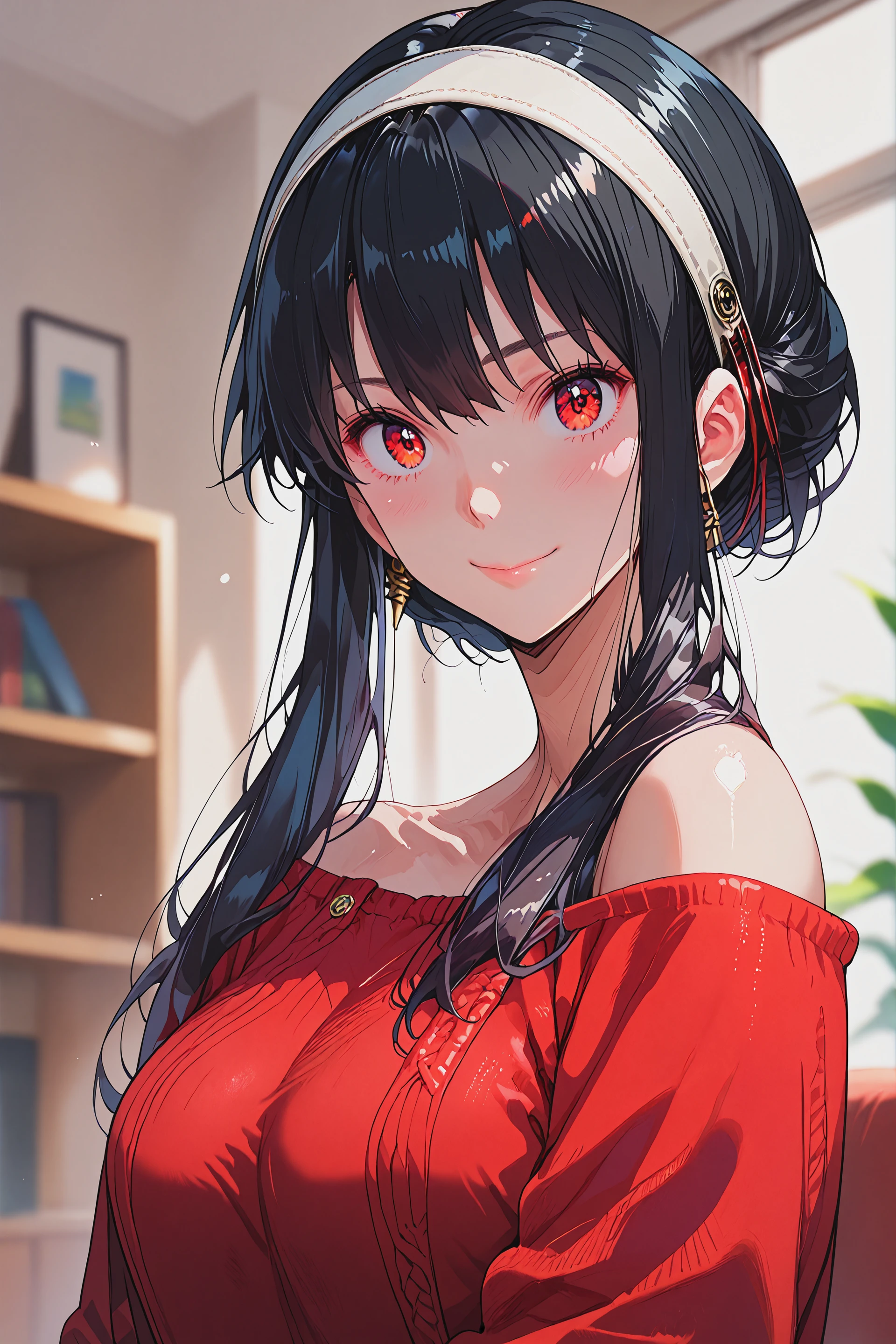 trigger word : ceii yyorr, sidelocks, twin sidelocks, red eyes, black hair, bangs,white hairband, red sweater, off shoulder, off-shoulder sweater, long sleeves, black pantyhose,