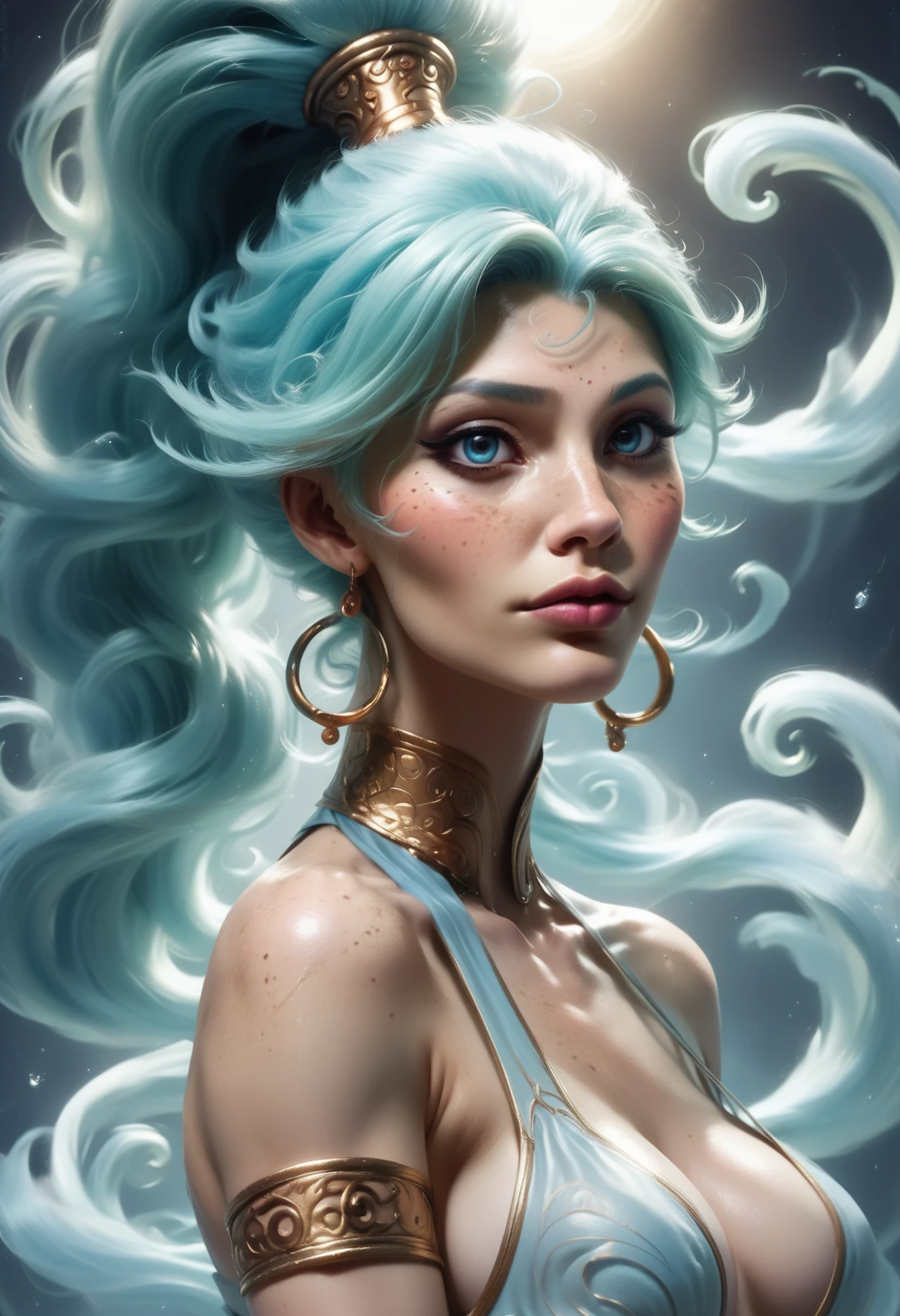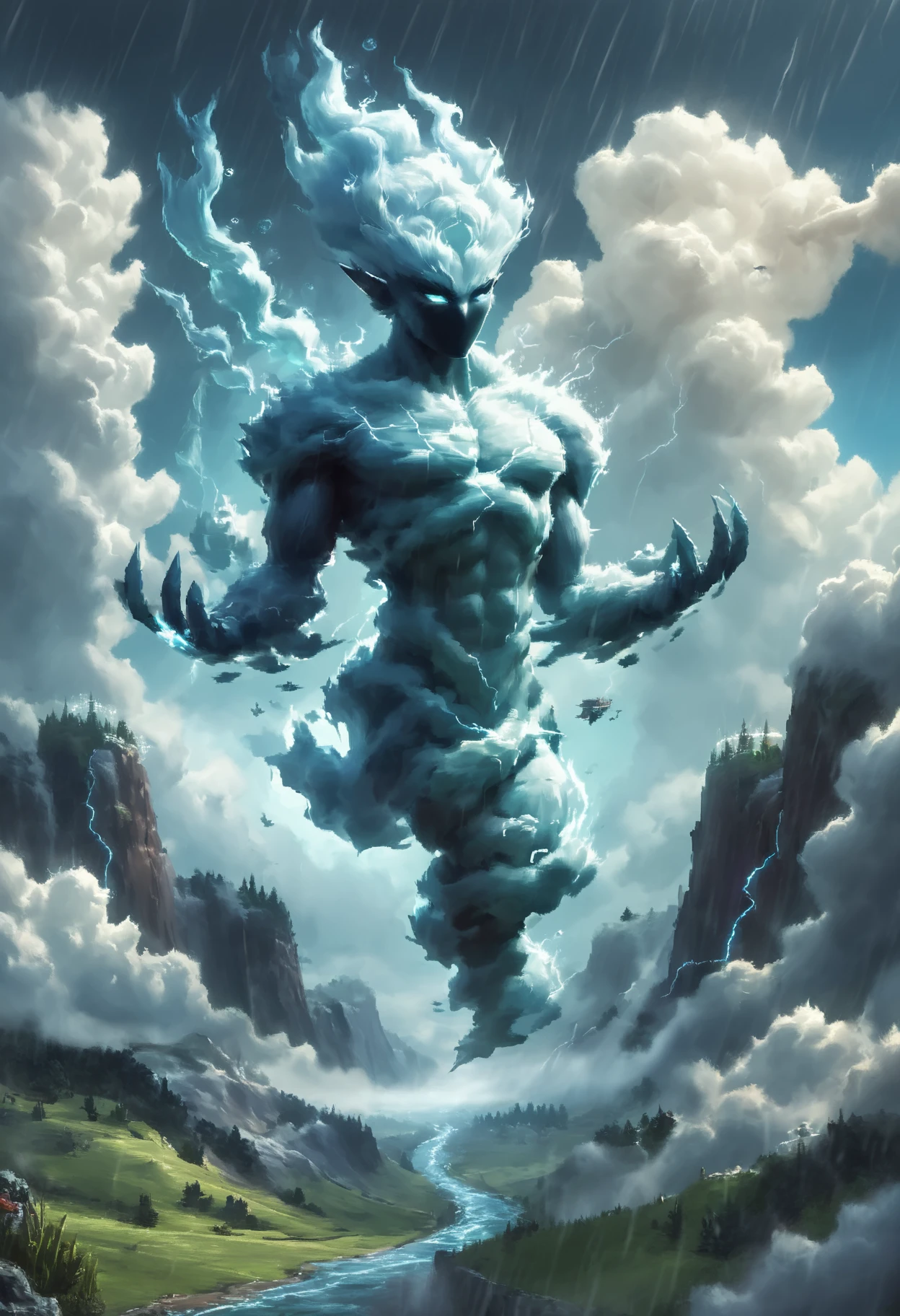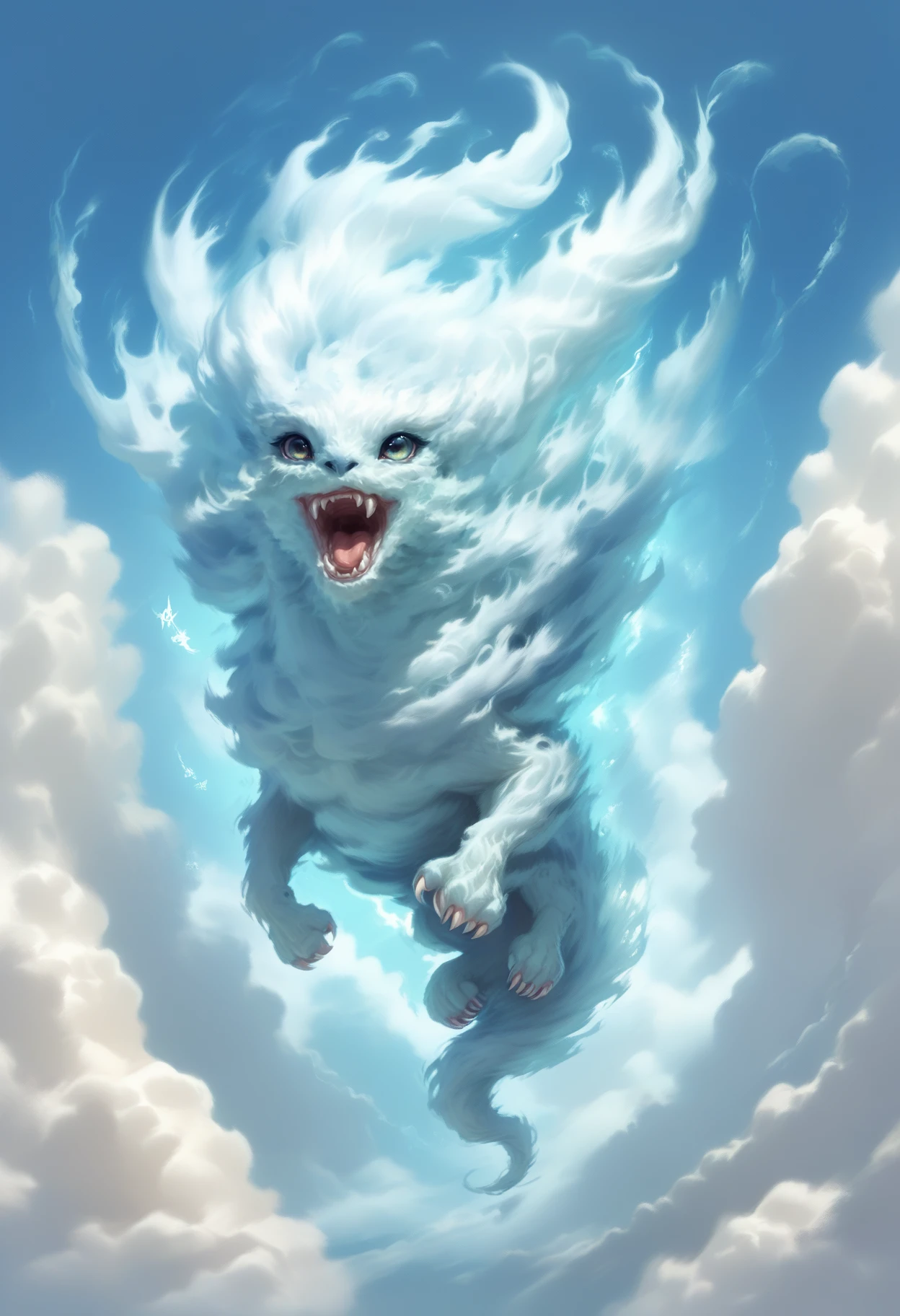 Recommended tags for making the LoRA come through the best: air elemental, ethereal creature, swirling air, magical elements, high fantasy, transparent, cloudy sky background.