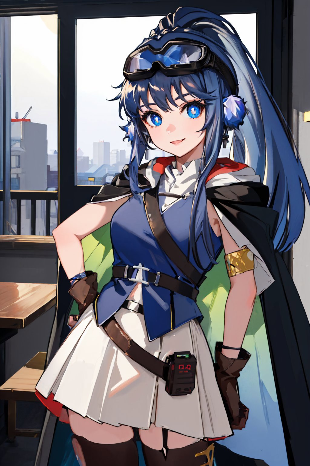 Default Outfit: goggles on head, blue shirt, cape, white skirt, thighhighs, boots, black gloves