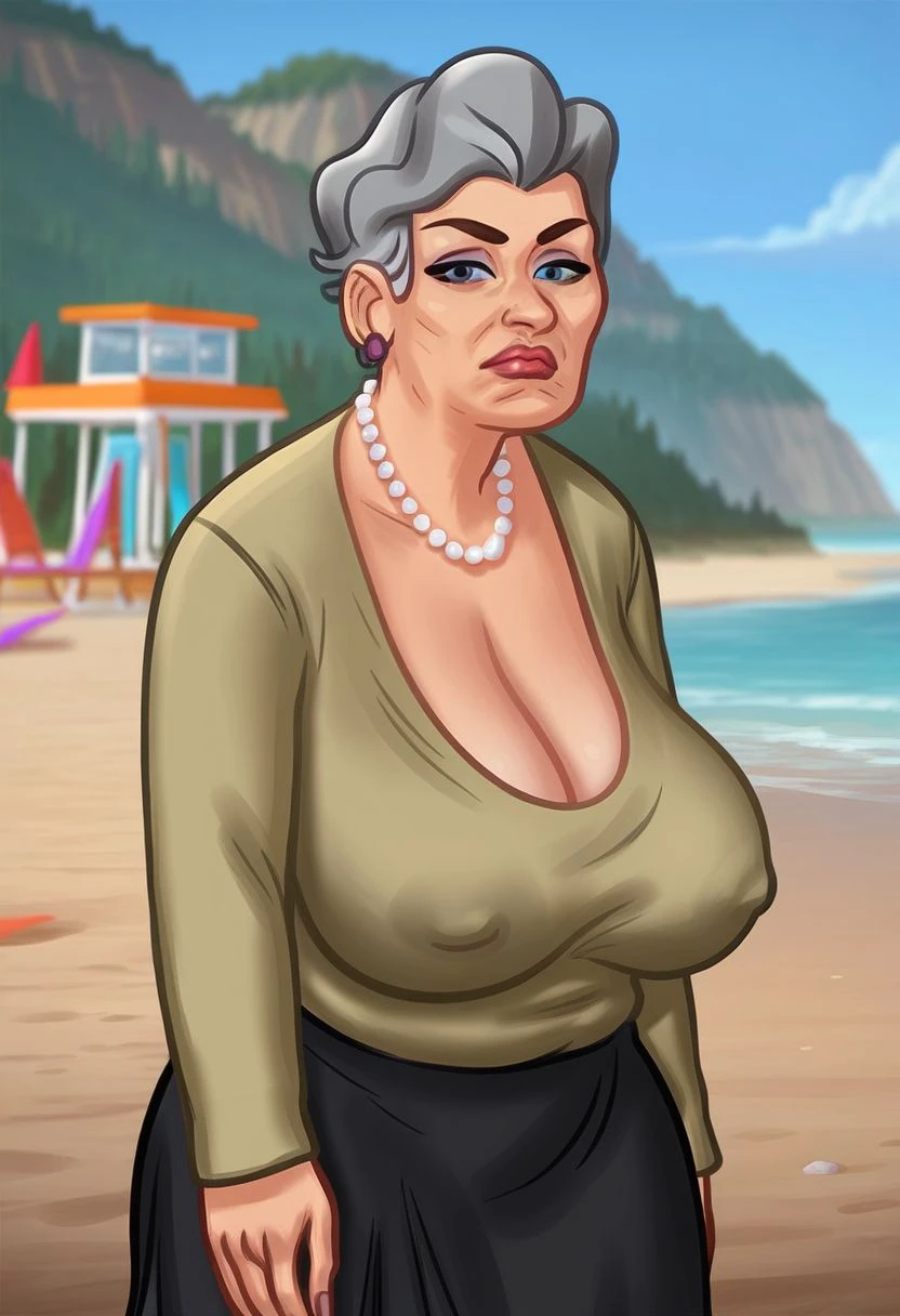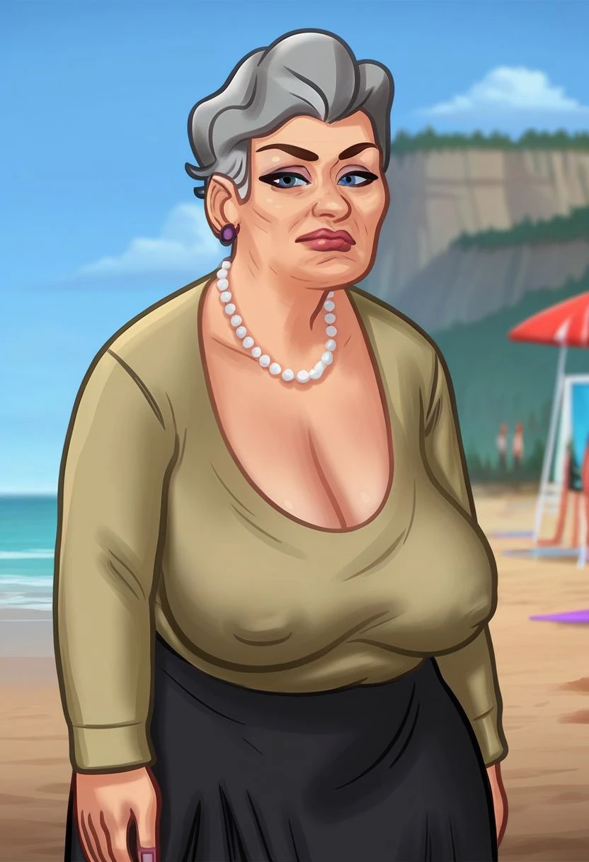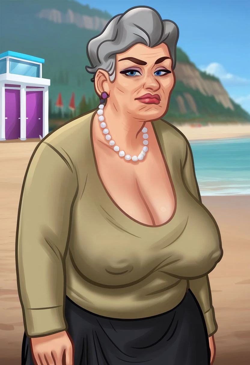 1girl, old woman, plump, blue eyes, grey hair