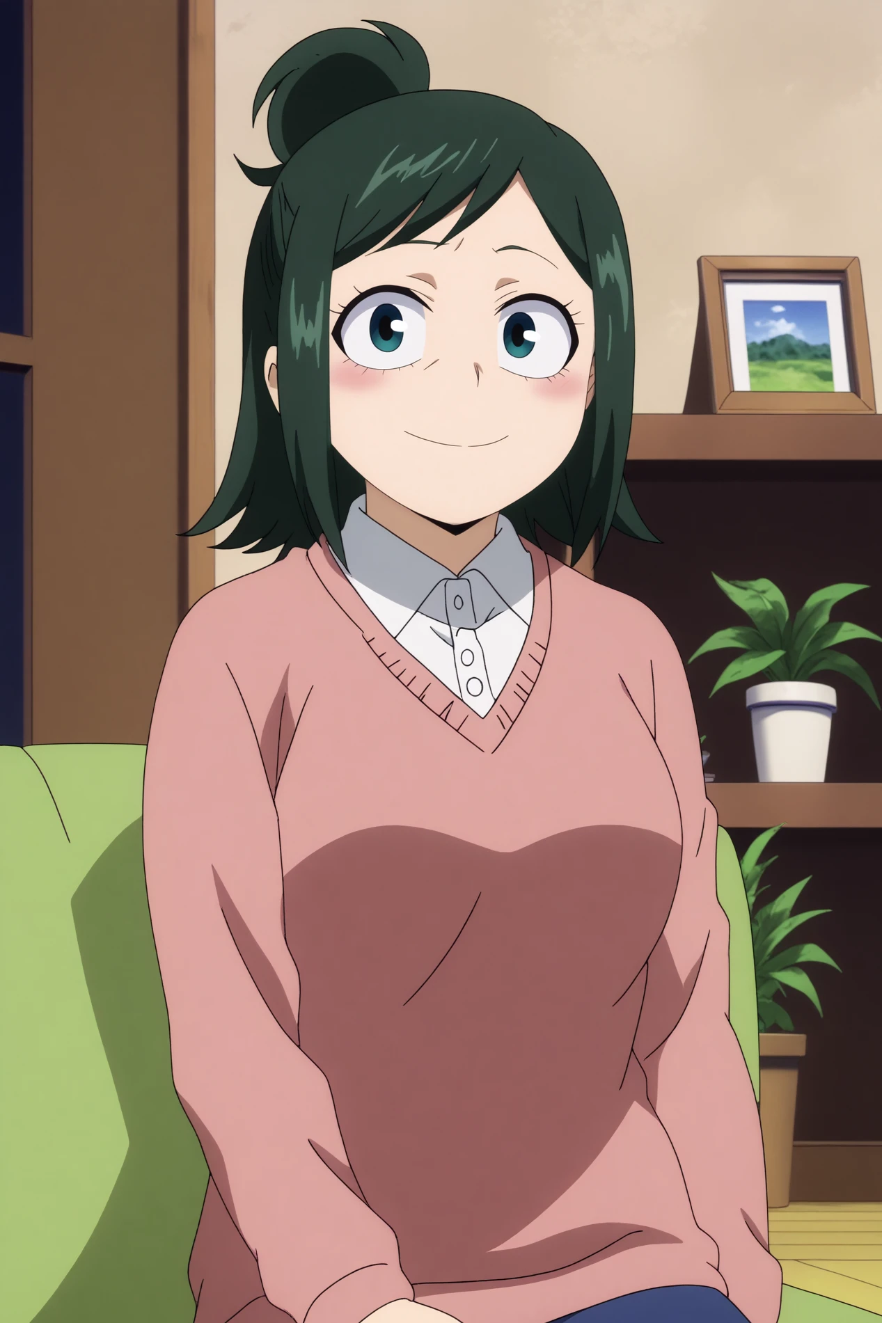 inko midoriya,1girl,solo,ponytail,smile,black hair,single hair bun,short hair,shirt,breasts,sweater