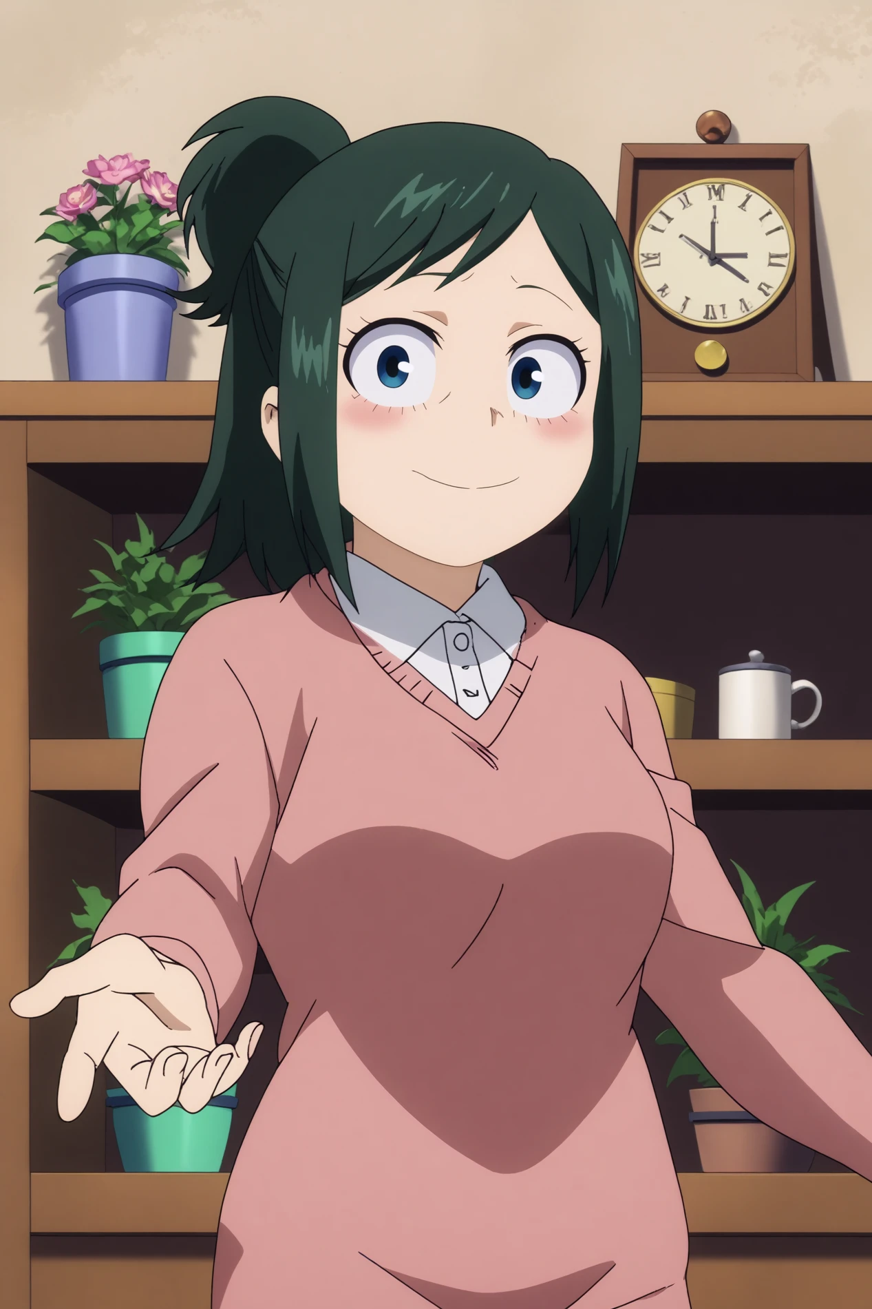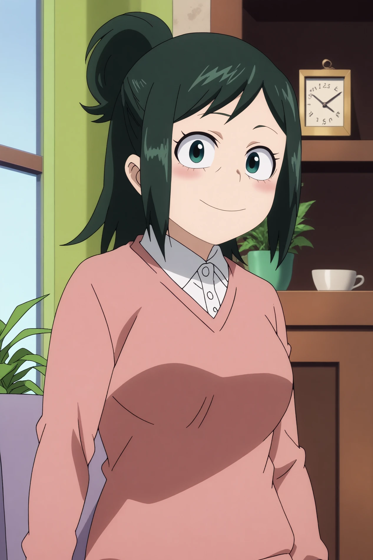 Triggers : inko midoriya,1girl,solo,ponytail,smile,black hair,single hair bun,short hair,shirt,breasts,sweater