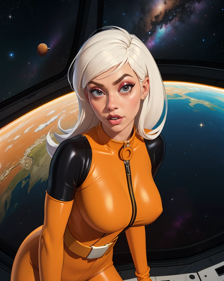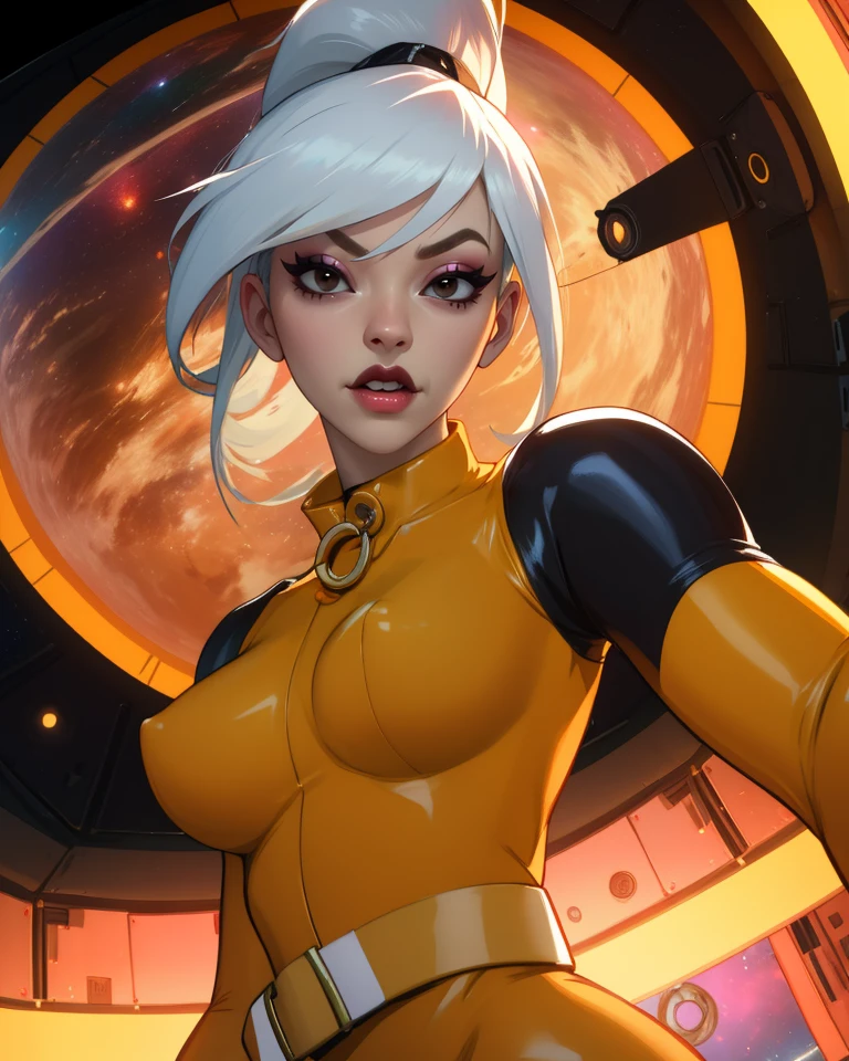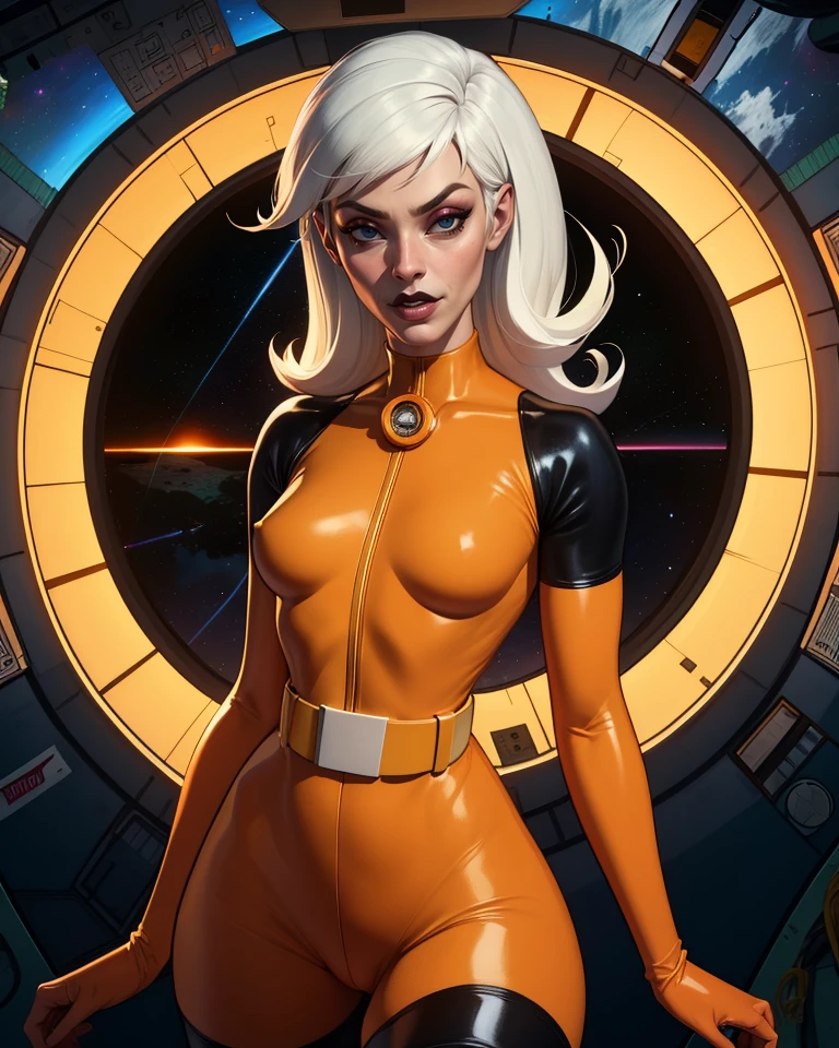 orange bodysuit, black thighhighs, yellow belt, orange elbow gloves, - o-ring, zipper,