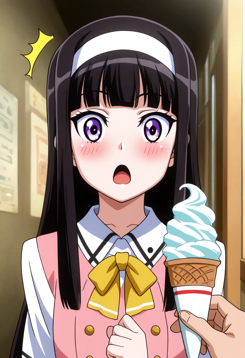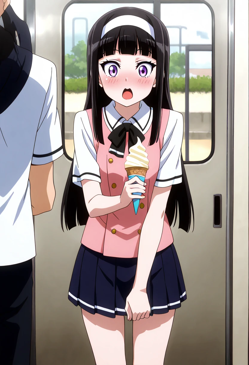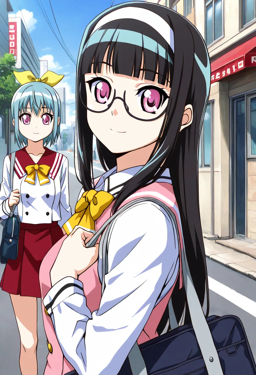 zzMidori, purple eyes, black hair, long hair, white hairband, pink vest, long sleeves, bow, school uniform, white shirt, black bowtie, red skirt,