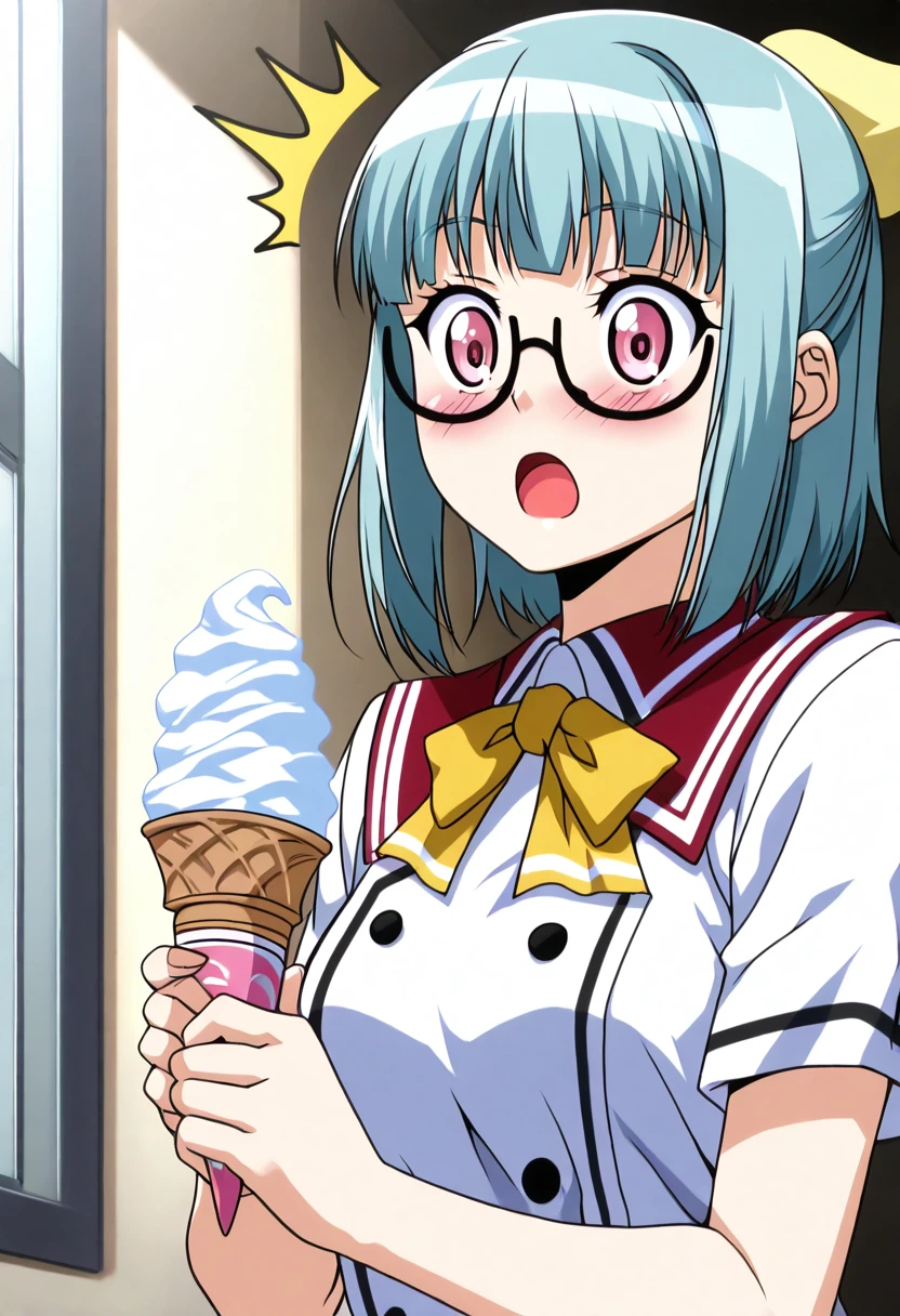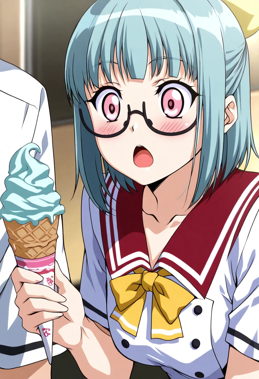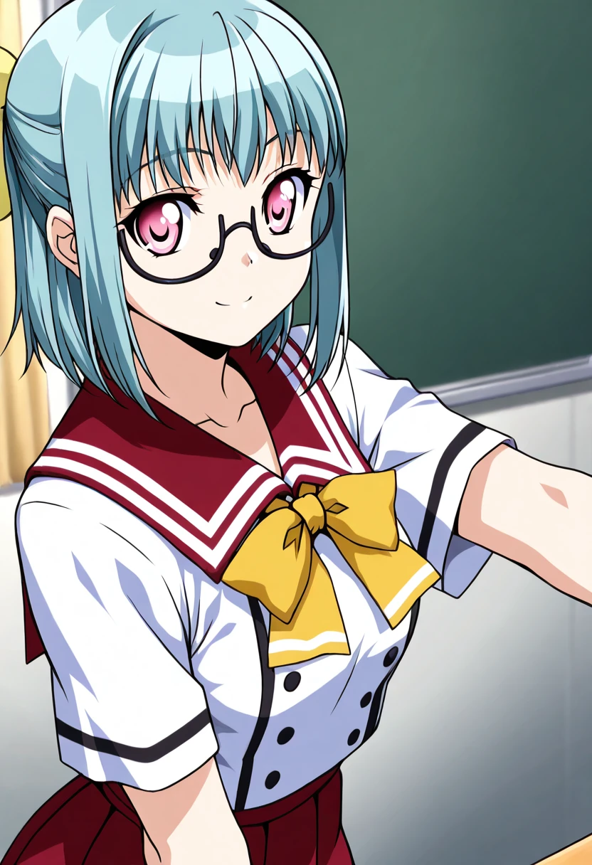 zzSuzu, pink eyes, aqua hair, short hair, half updo, semi-rimless eyewear, short sleeves, yellow bowtie, school uniform, white shirt, red skirt,