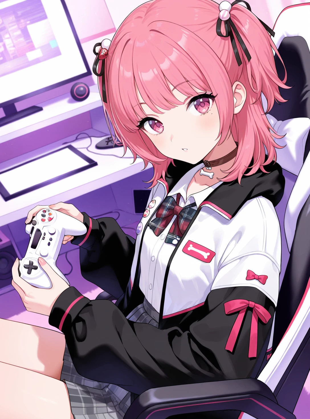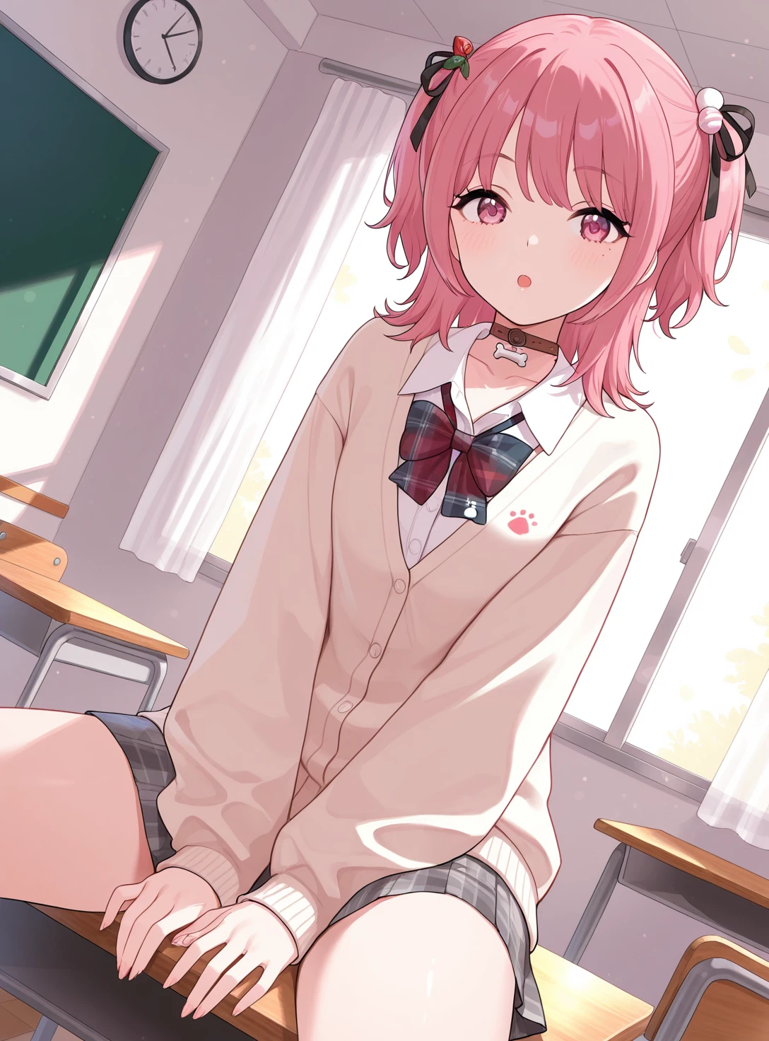 PitaUniform, medium hair, two side up, hair ornament, dog hairclip, mole under eye, bone pendant choker, cardigan, shirt, bowtie, plaid pleated skirt,